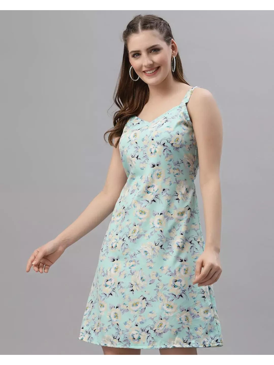 This soothing and gorgeous A-line mini dress comes with delicate floral prints, a v-neck and shoulder straps that give away an elegant and chic style. Pair this perfect-length mini dress with simple accessories and high heels for a cute brunch date.