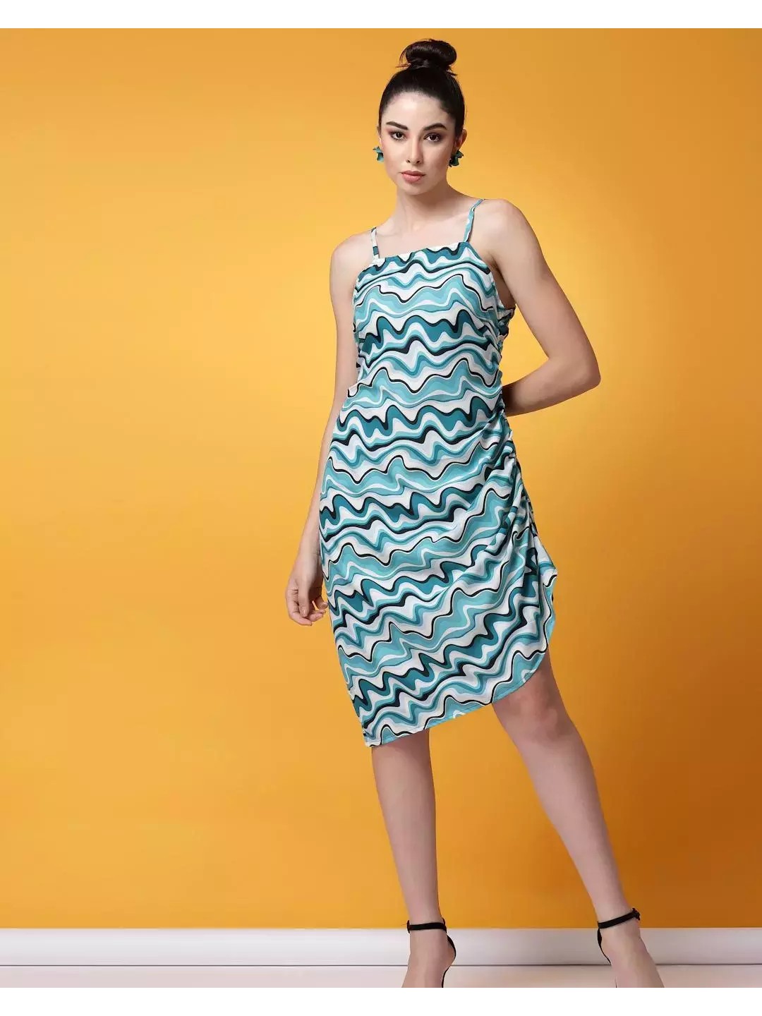 The side ruched design is a highlight of this abstract print midi dress. Made from crepe, this dress is incredibly light and comfortable to wear, ideal for daily use. Pair this gorgeous dress with accessories and flaunt your beautiful legs in any casual look.