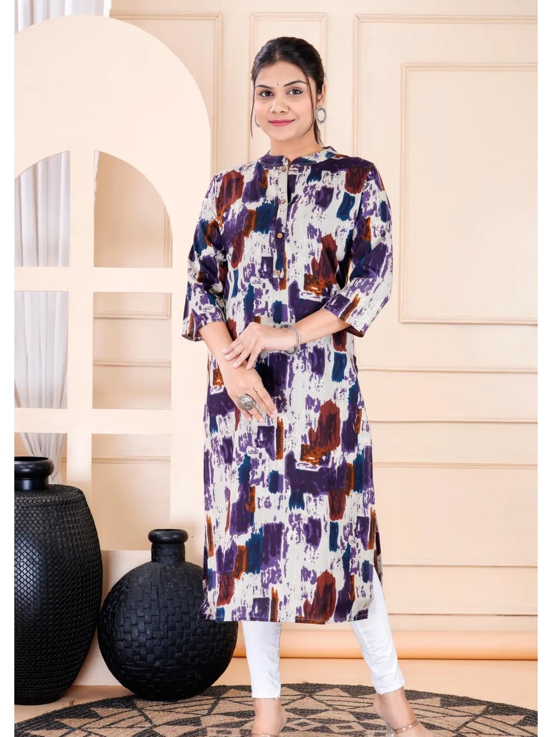 Abstract Printed Navy Blue Straight Kurti for Women that has abstract prints, straight length, band collar and three-quarter sleeves. Made with rayon fabric, this kurti is super light, comfy and easy to style for daily casual wear.
