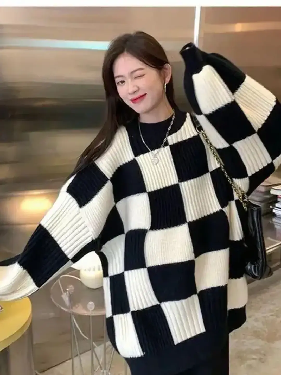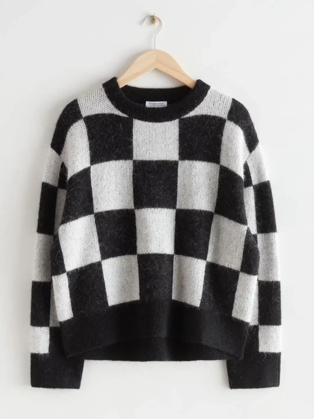 Product Name: Black Checked Wool Relaxed Pullover for Women