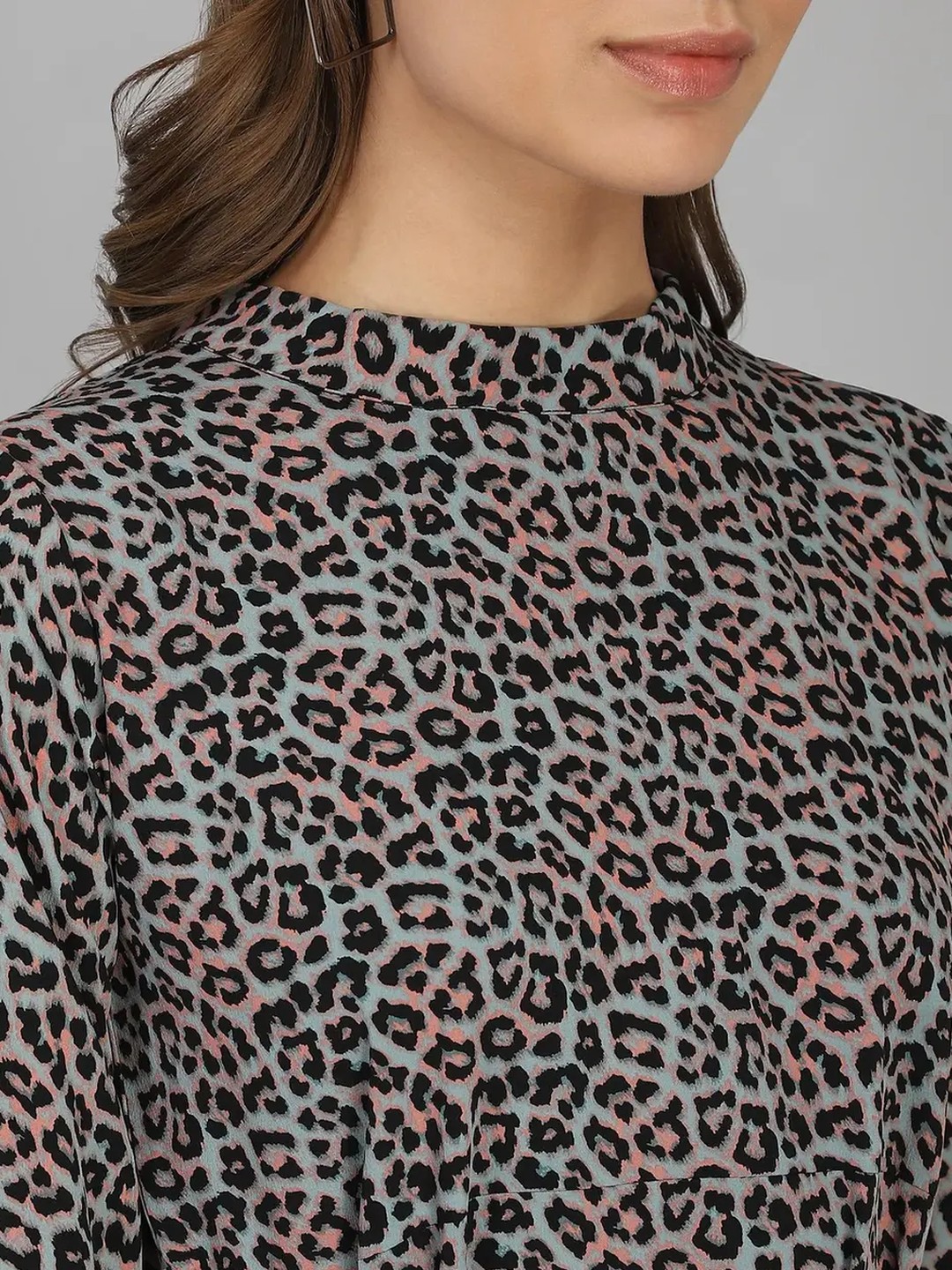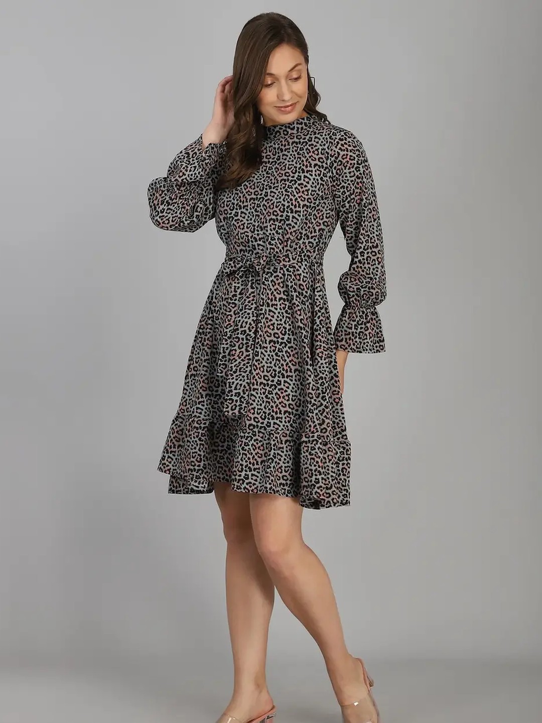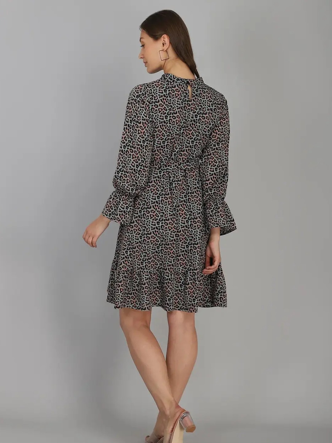 Product Name: Black Cheetah Printed Midi Ruffle Dress for Women