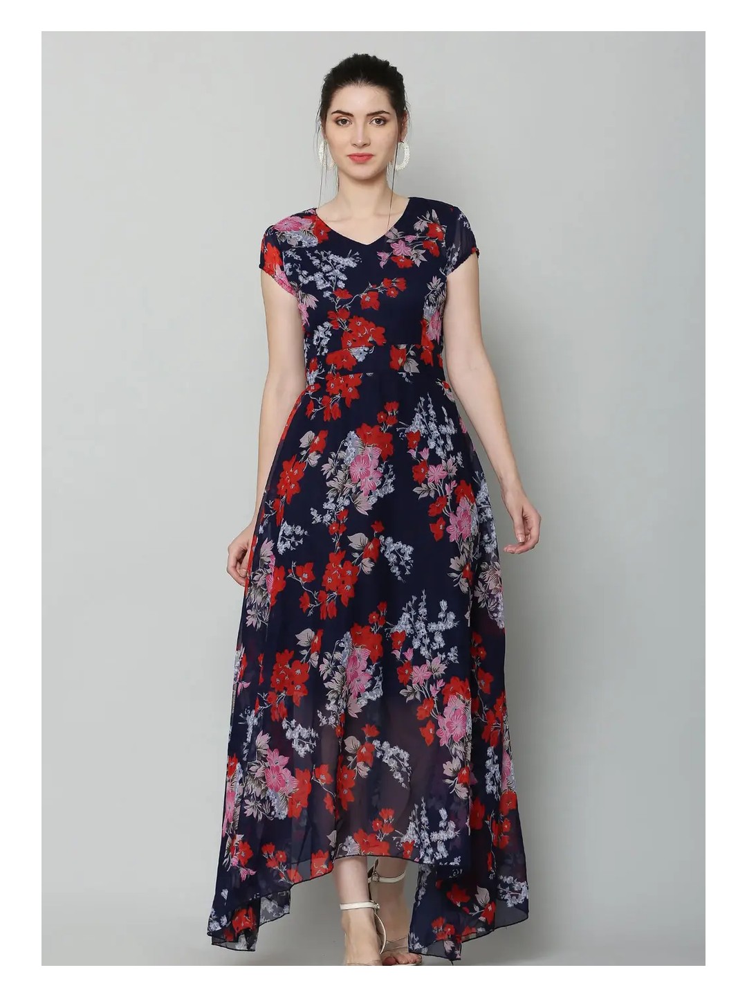 Product Name: Black Floral Asymmetric Maxi Dress for Women