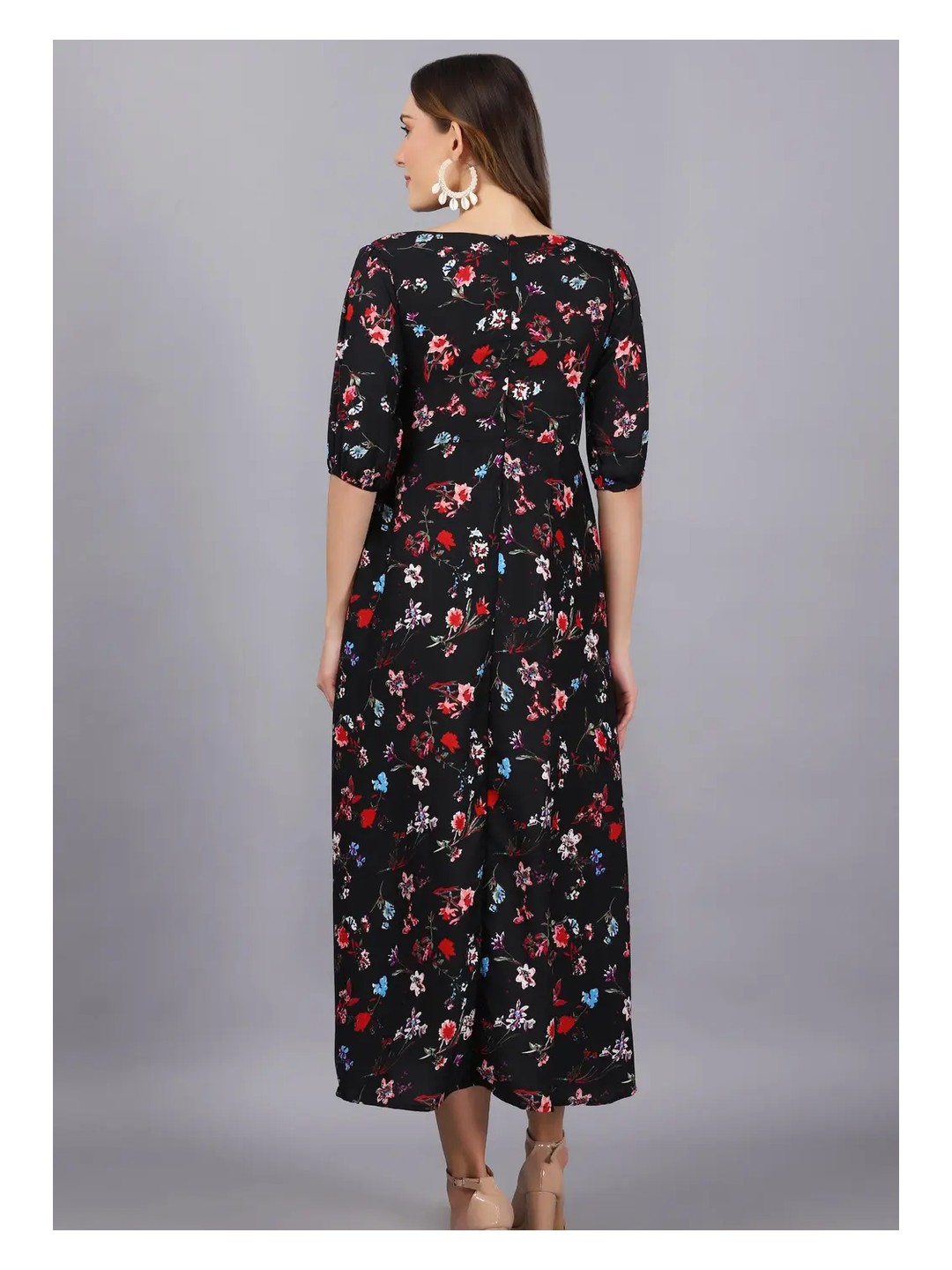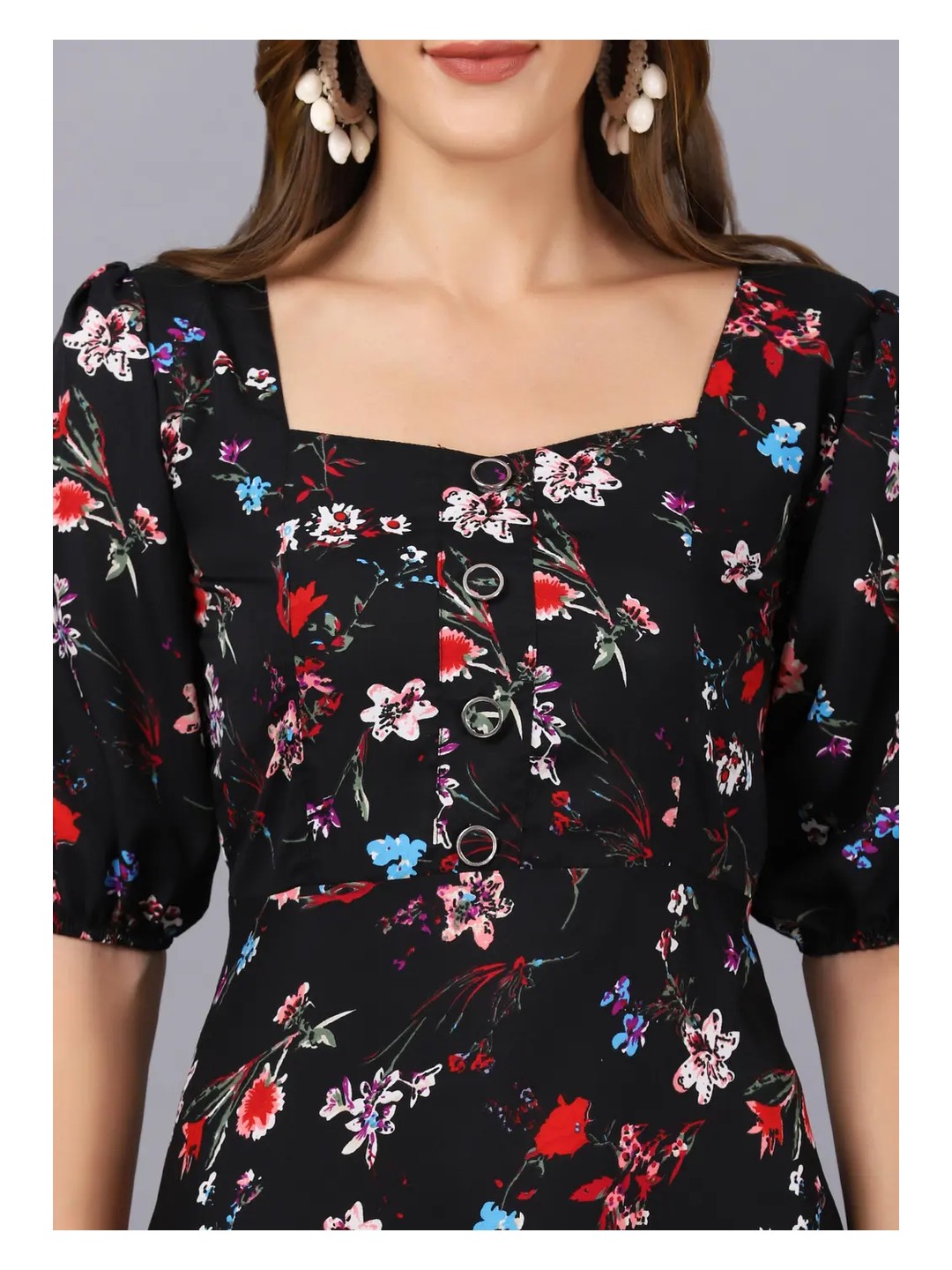 Product Name: Black Floral Puff Sleeve Maxi Dress for Women