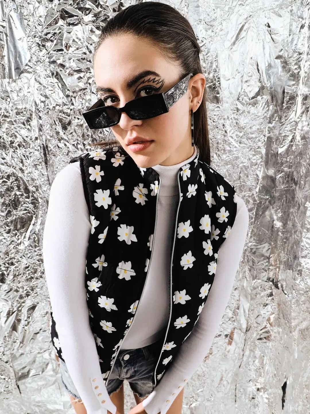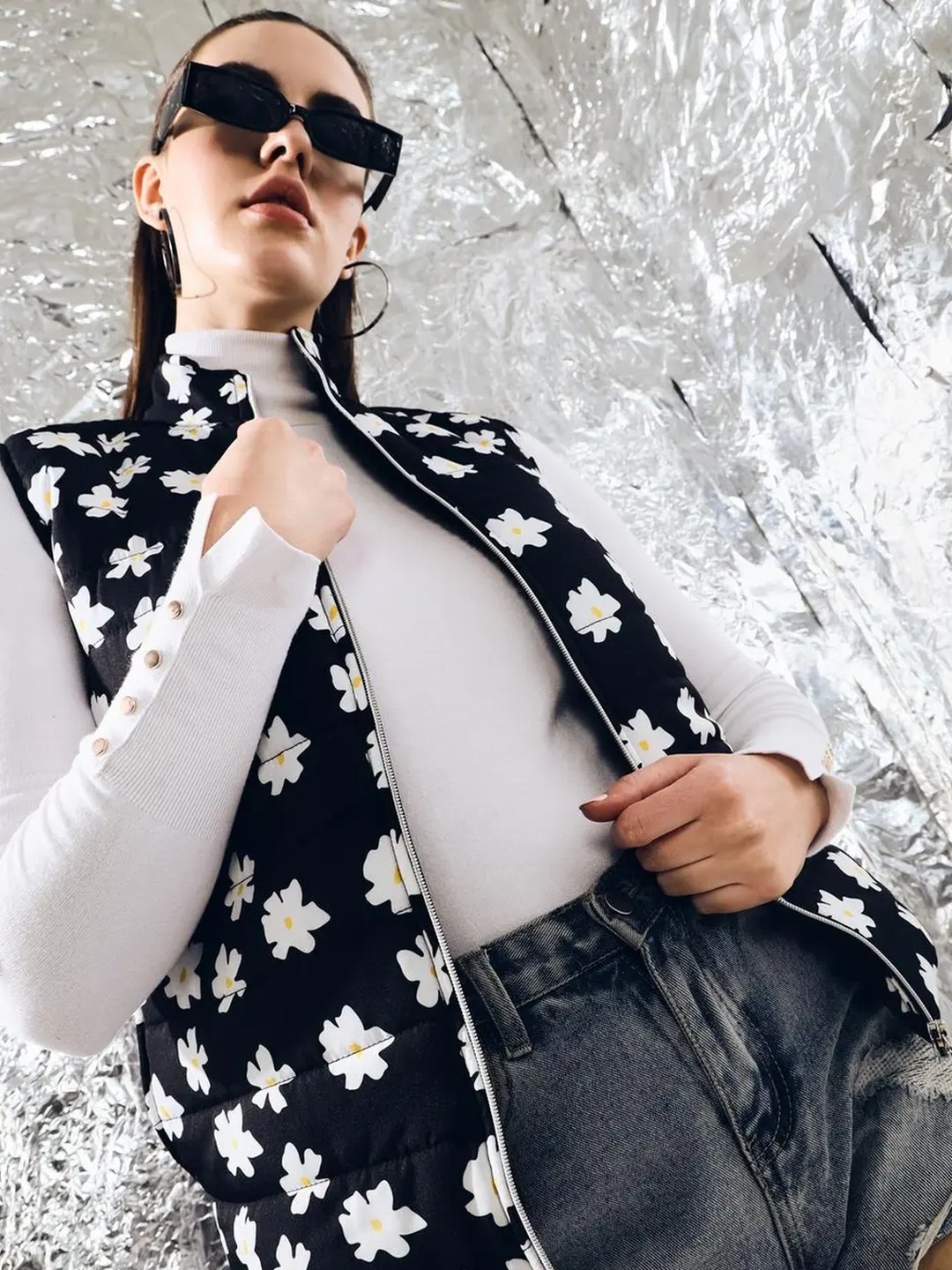 Product Name: Black Floral Zip-Up Sleeveless Puffer Jacket for Women