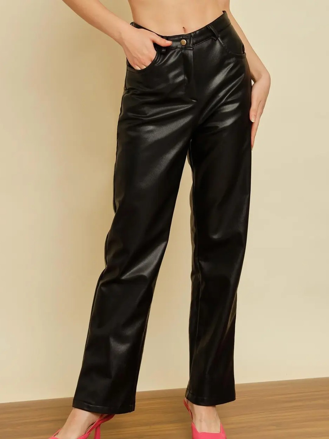 Black High Rise Leather Pants for Women that has a slim fit and an ankle length. This high rise leather pants can be styled with crop tops for a bold vibe.