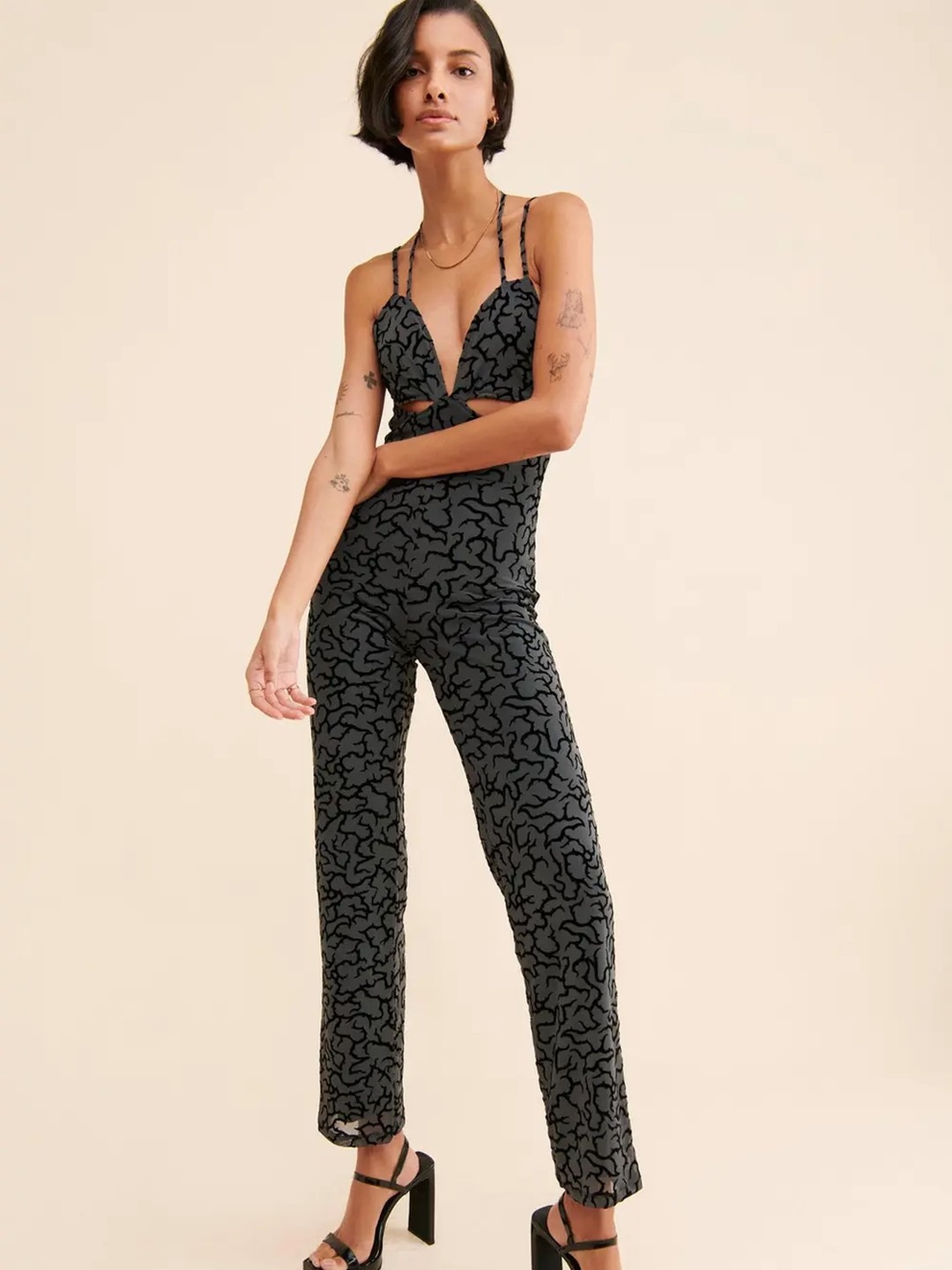 Black Printed Cut-out Skinny Jumpsuit for Women that has side cut-out details and a skinny fit to define your curves. This printed cut-out skinny jumpsuit can be styled for a bold fashion-forward look.