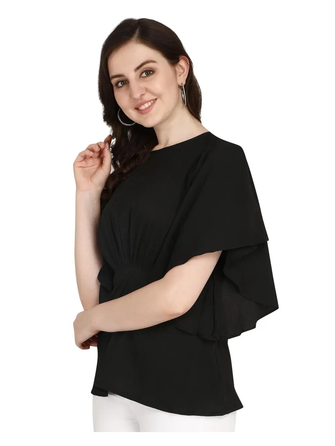 Black Regular Ruffle Top for Women that has a regular length, ruffle sleeves and a slim fit. This lycra ruffle top can be styled in versatile ways for an elegant feminine look.