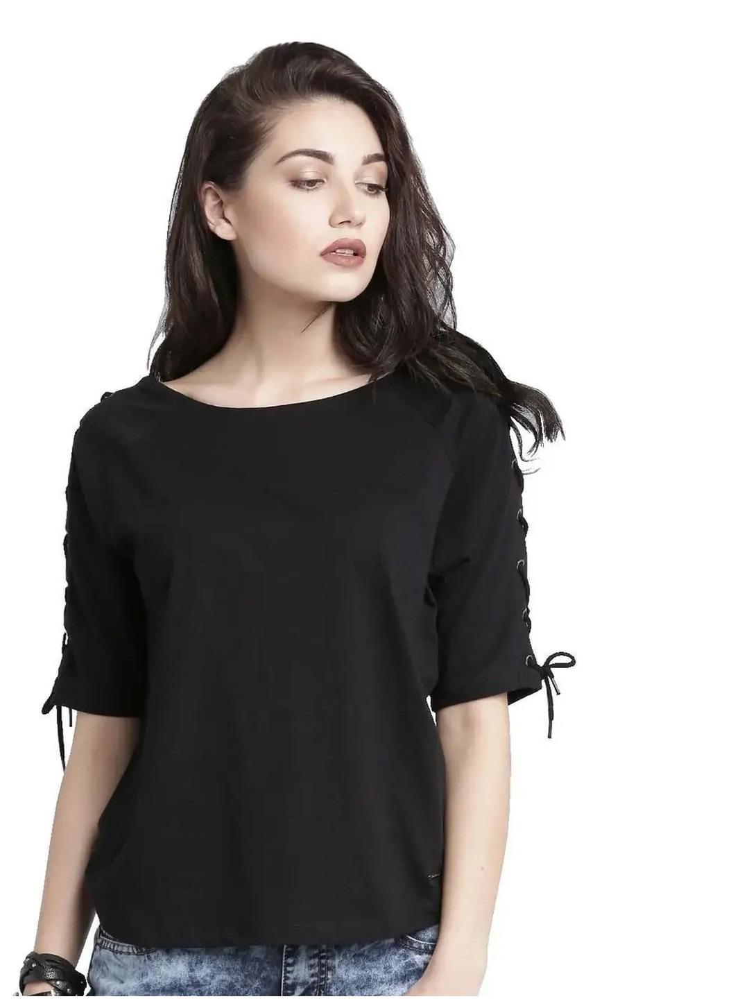Black Tie-Up Regular Top for Women that has a regular length, slim fit and a sleeve tie-up detail. This lycra tie-up regular top can be styled in versatile ways for your desired look.