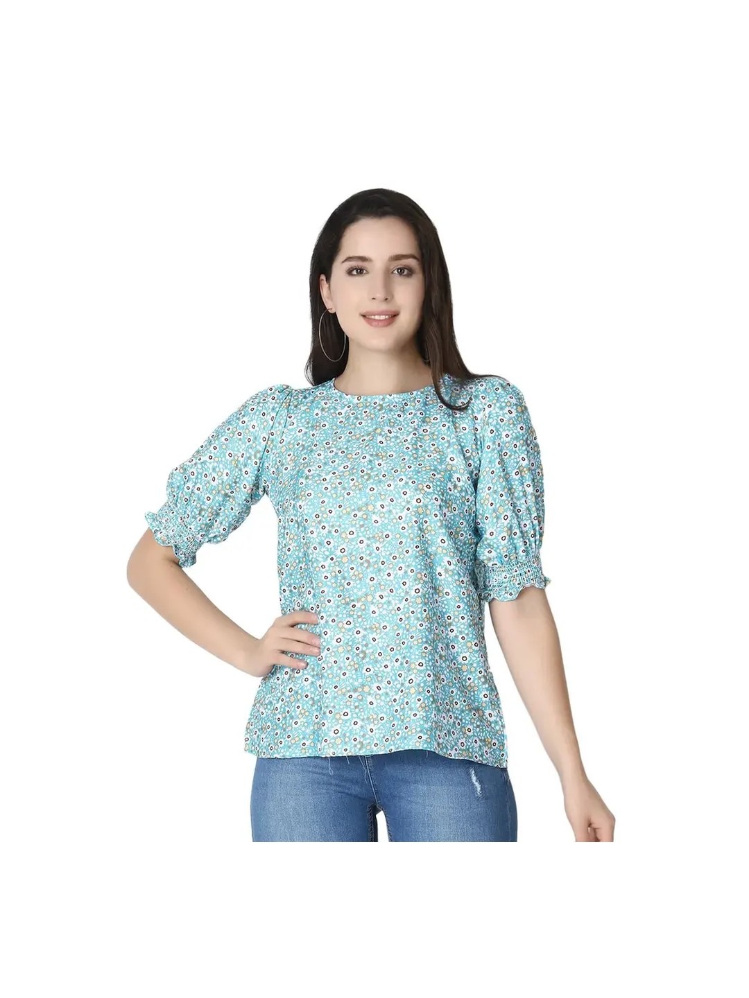 Blue Floral Ruffle Top for Women that has intricate ruffles on sleeve hem, regular length and a slim fit. This rayon floral ruffle top can be styled with solid bottoms for a cute and elegant look.