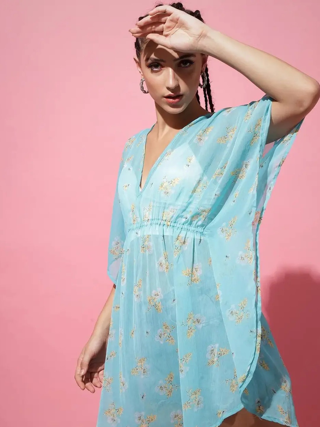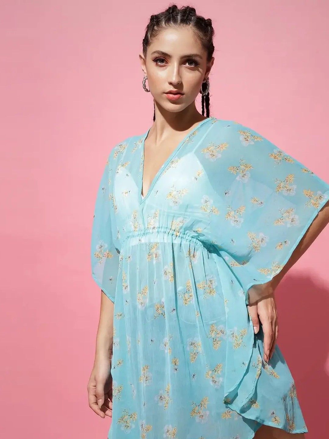 Product Name: Blue Floral Sheer Kaftan Dress for Women