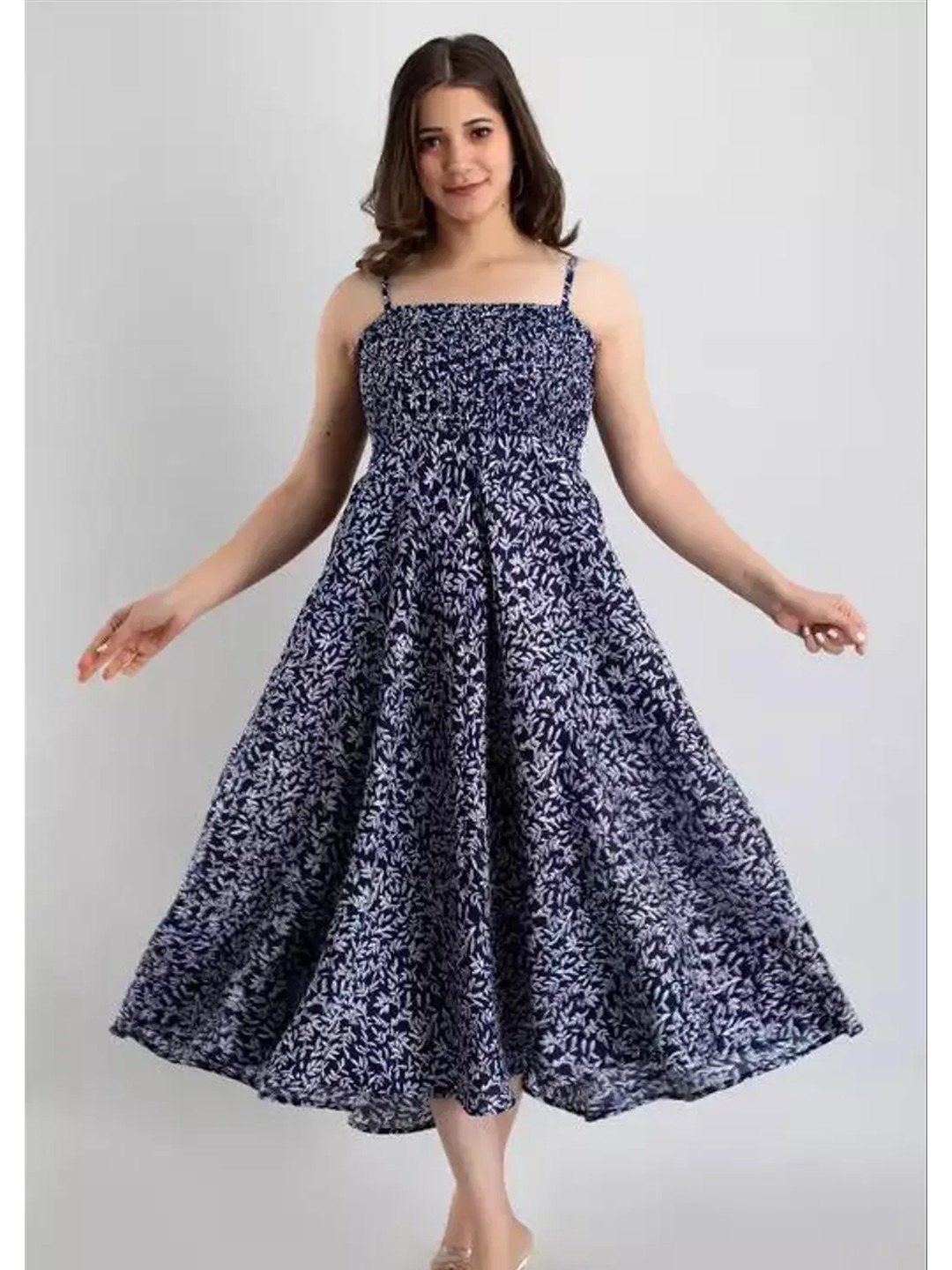 Product Name: Blue Sleeveless Printed Smocked Fit and Flare Midi Dress for Women