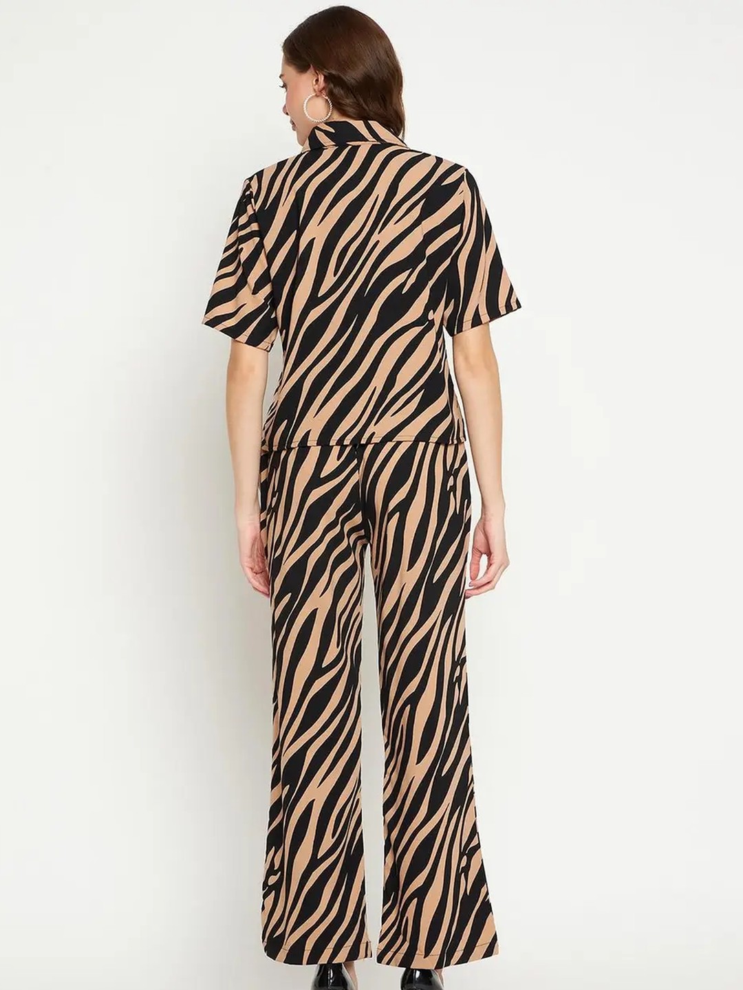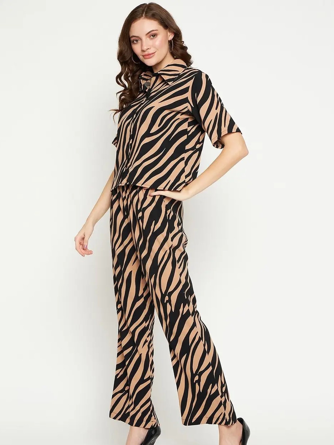 Brown Animal Printed Shirt Co-ord Set for Women that has intricate prints and a slim fit. This animal printed shirt co-ord set can be styled with simple accessories for a chic look.