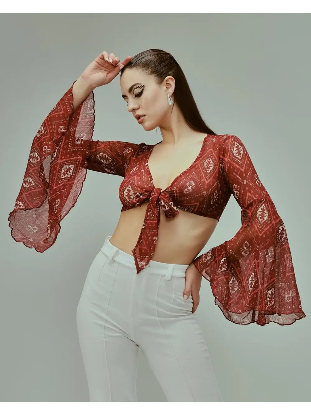 Brown Printed Tie-Up Bralette Top for Women that has intricate prints, long flare sleeves, tie-up detail and a bralette style. This polyester tie-up bralette top can be styled with solid bottoms and gold accessories for a flattering look.