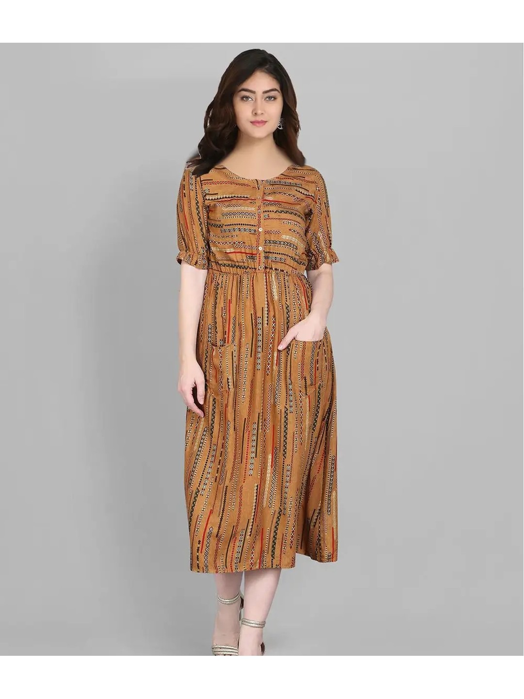 Brown Striped Midi A-line Dress for Women that has intricate stripes, front pockets and a midi length. This cotton slub striped midi A-line dress can be styled for a chic and elegant look effortlessly.