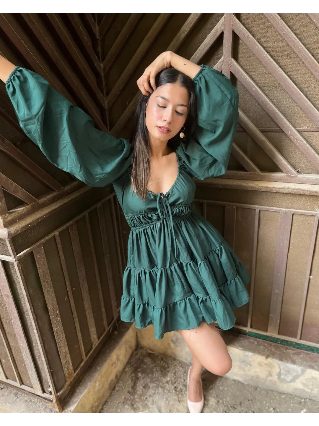 Dark Green A-line Mini Tiered Dress for Women that has long sleeves, mini length and gorgeous tiered detail. This crepe mini-tiered dress also has a front tie-up detail that further adds to the grace and charm of this mini dress.