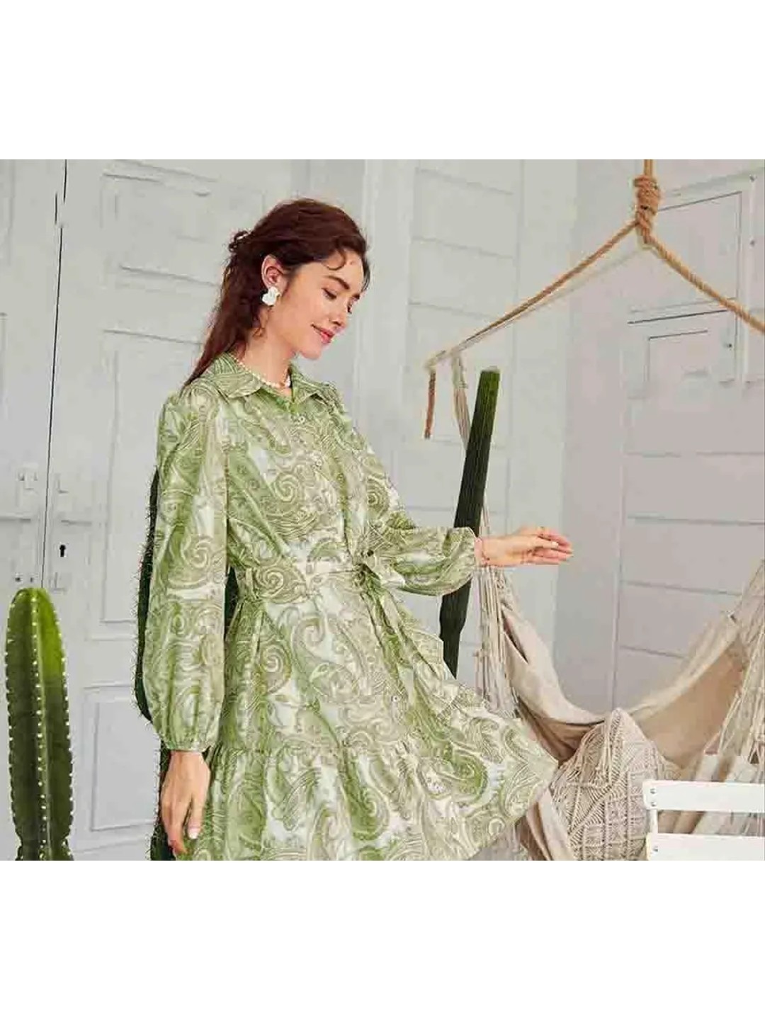 Ethnic Gota Printed Shirt Dress for Women that has a collar, long sleeves, versatile ethnic gota prints and a waist belt for a defined appealing look. This dress is a graceful yet modern choice with its unique fusion of ethnic and modern design that can be styled with a pearl necklace for a vintage aesthetic look.