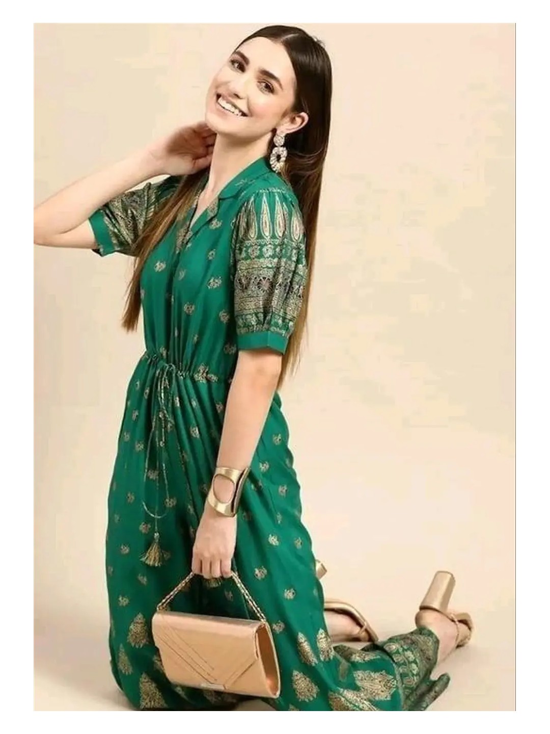 Ethnic Motifs Foil Print Jumpsuit for Women that has short puff sleeves, collar with premium buttons, cinched waist and a waist tie-up detail. This jumpsuit has an ankle length and is made of rayon fabric that looks best with high heels. This light, comfy and stylish jumpsuit can be styled effortlessly with the right accessories and makeup that gives you a chic elegant look perfect for casual or semi-formal occasions.