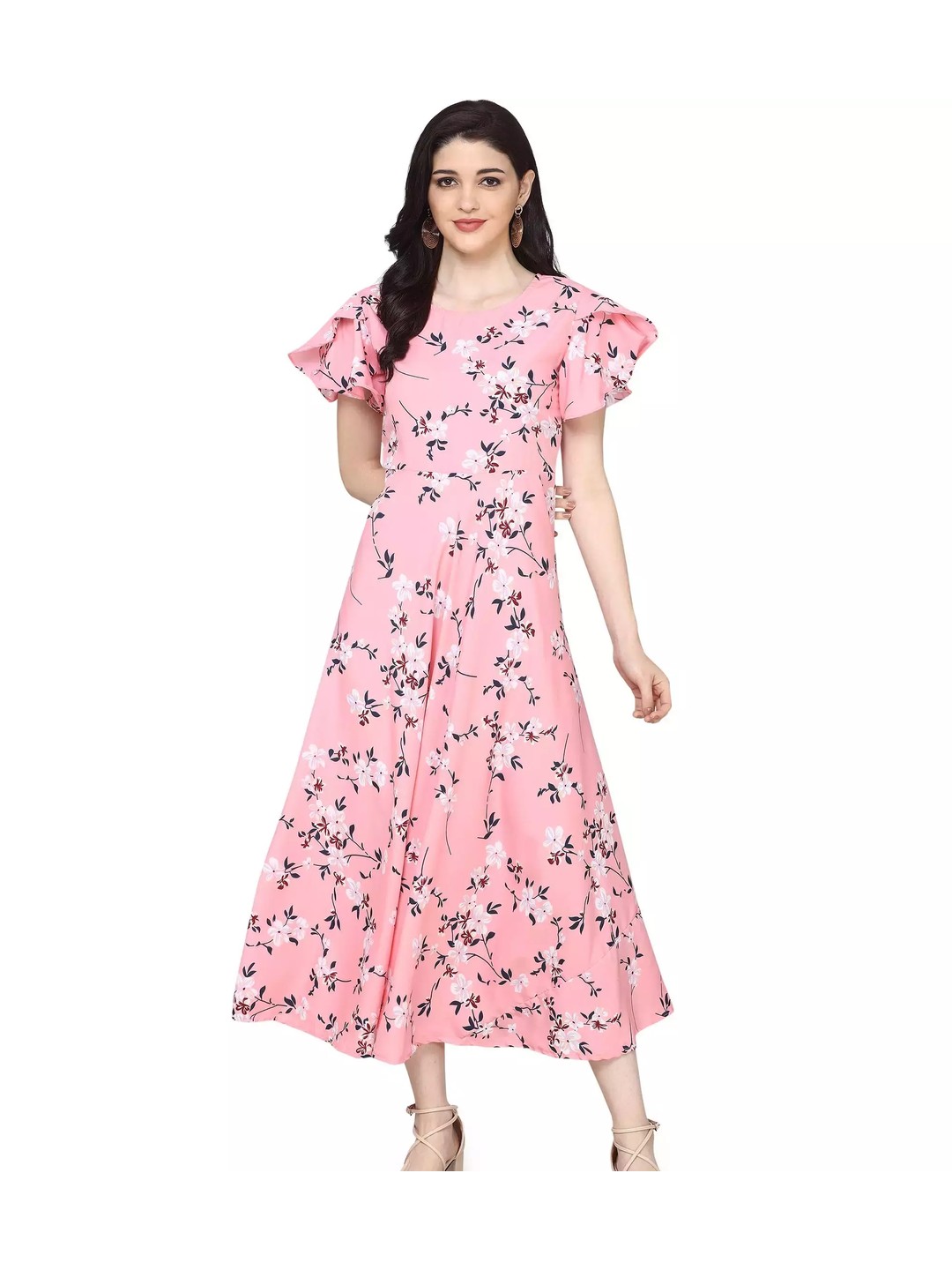 A vibrant floral maxi dress that has an A-line feature, short flutter sleeves and a relaxed fit. This dress emphasizes your waist effortlessly and blesses you with a flattering silhouette. This dress can be paired with any heels and a small handbag for a youthful classy look.
