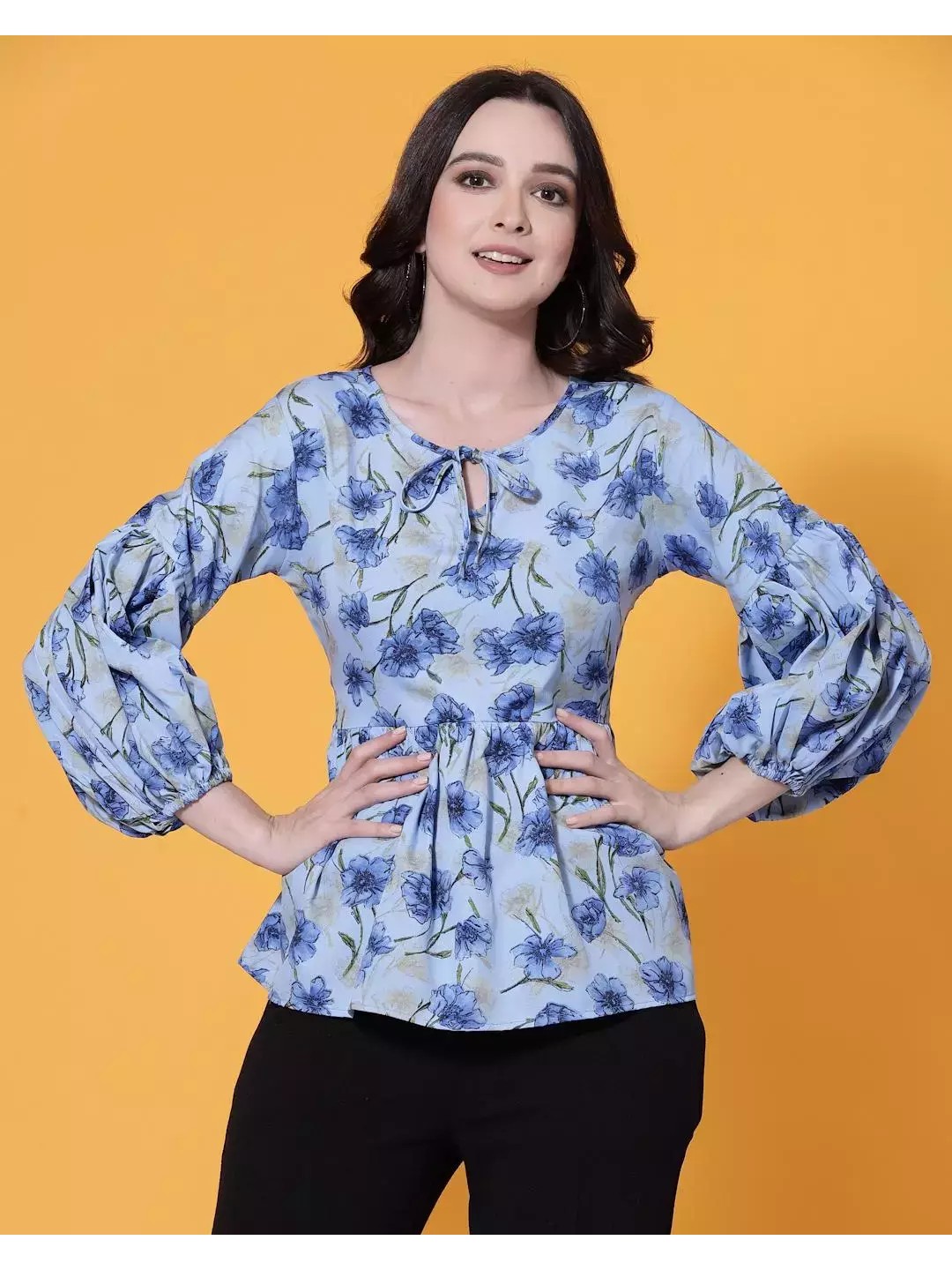 Peplum top with floral prints and long bishop sleeves made with crepe fabric that’s breathable and comfortable on the skin. Style this tunic top with silver jhumkas and jeans for a bold, stylish and elegant look.
