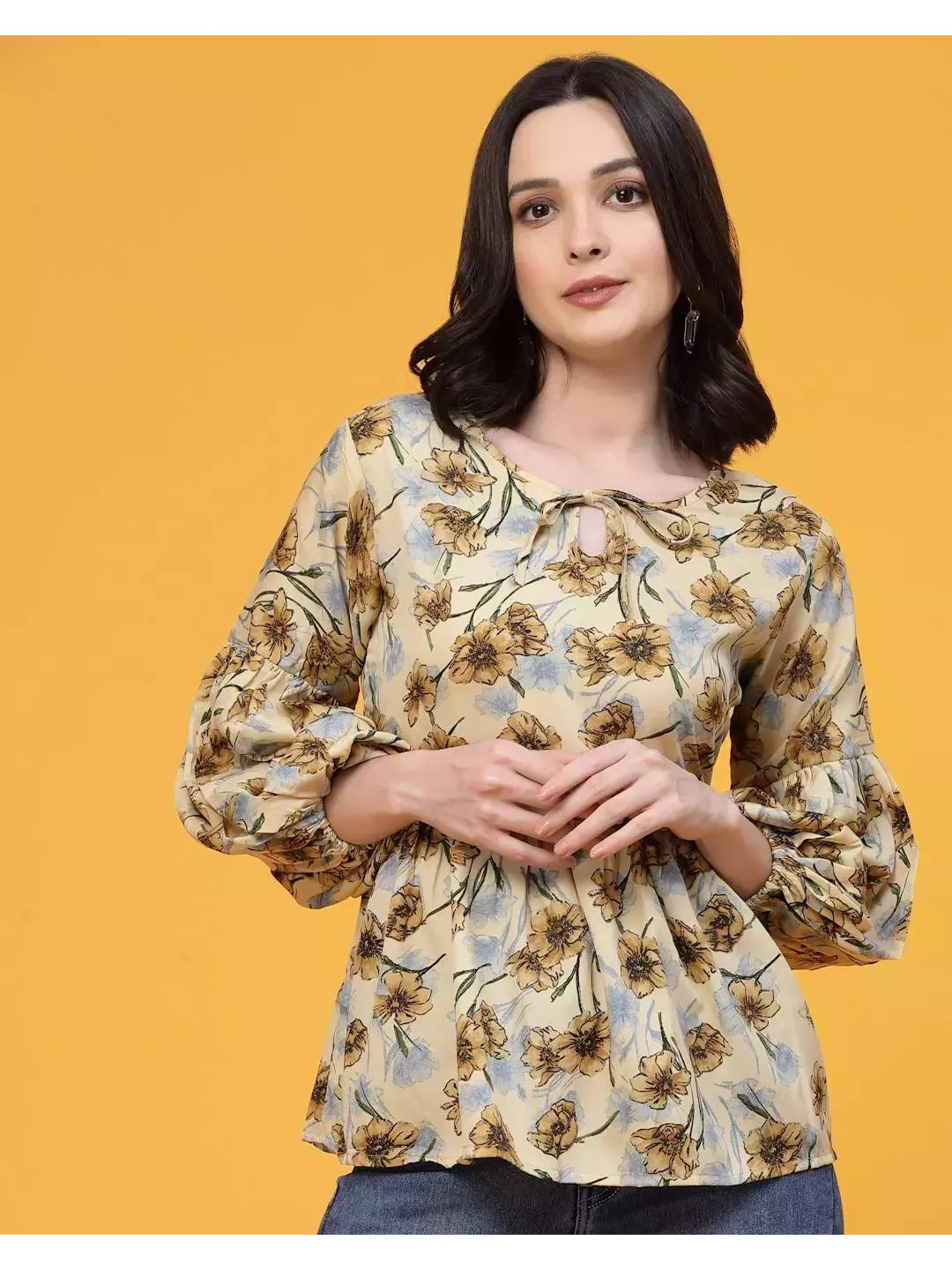 Peplum top with floral prints and long bishop sleeves made with crepe fabric that’s breathable and comfortable on the skin. Style this tunic top with silver jhumkas and jeans for a bold, stylish and elegant look.