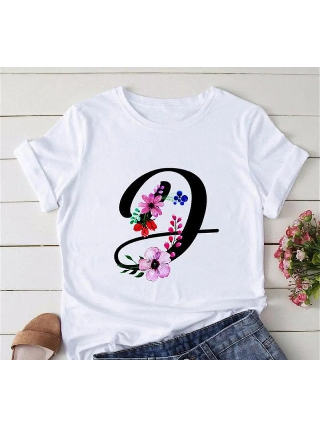 Product Name: Floral Printed D Letter White T-shirt for Women