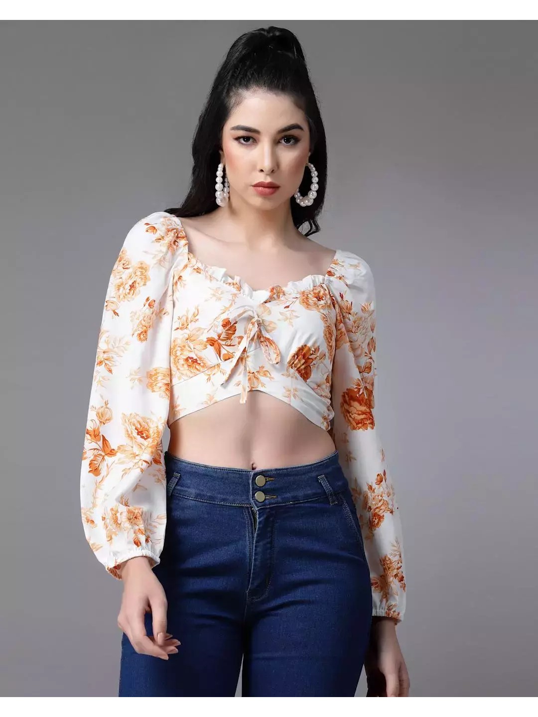 Floral crop top that comes with puff sleeves, sweetheart neckline, and a tie-up detail that effortlessly creates a contemporary graceful look. This delicately designed crop top has an appropriate length that can be styled with pants or a skirt for a stunning look.