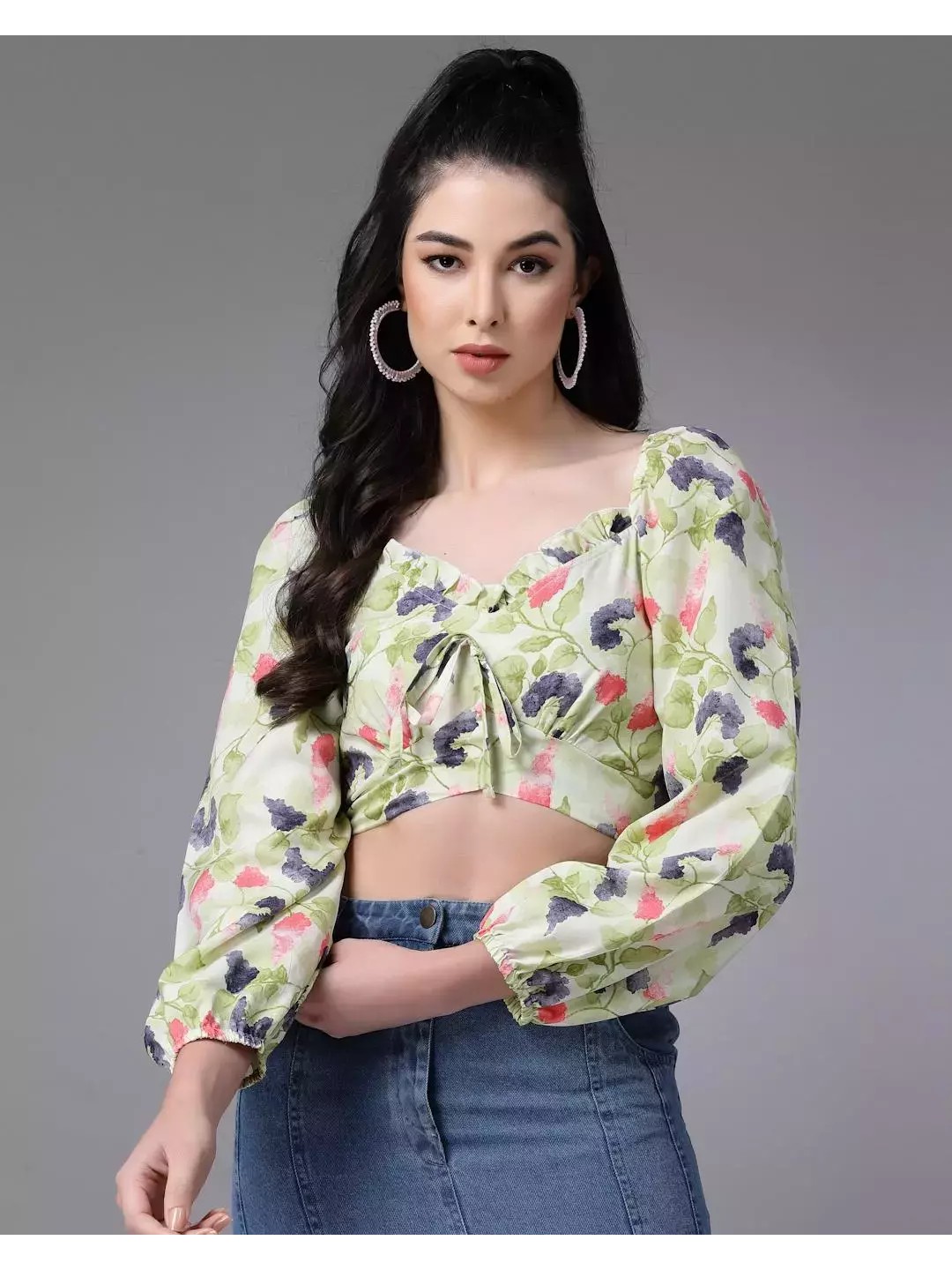 Floral crop top that comes with puff sleeves, sweetheart neckline, and a tie-up detail that effortlessly creates a contemporary graceful look. This delicately designed crop top has an appropriate length that can be styled with pants or a skirt for a stunning look.