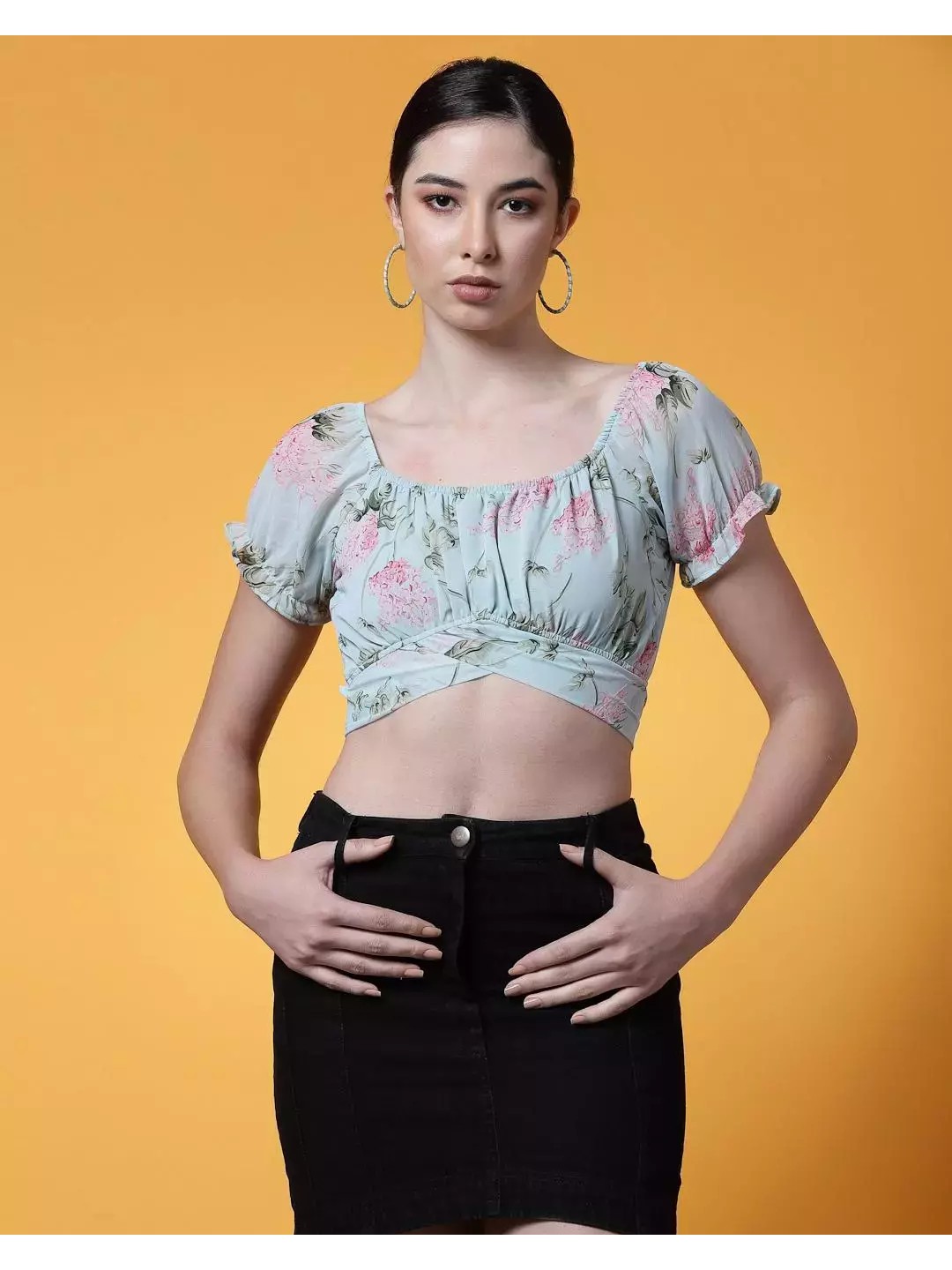 Floral crop top with wrap hem and short puff sleeves designed beautifully with delicate ruffles and a snug fit. Pair with a long flowy maxi skirt for a dreamy contemporary look.