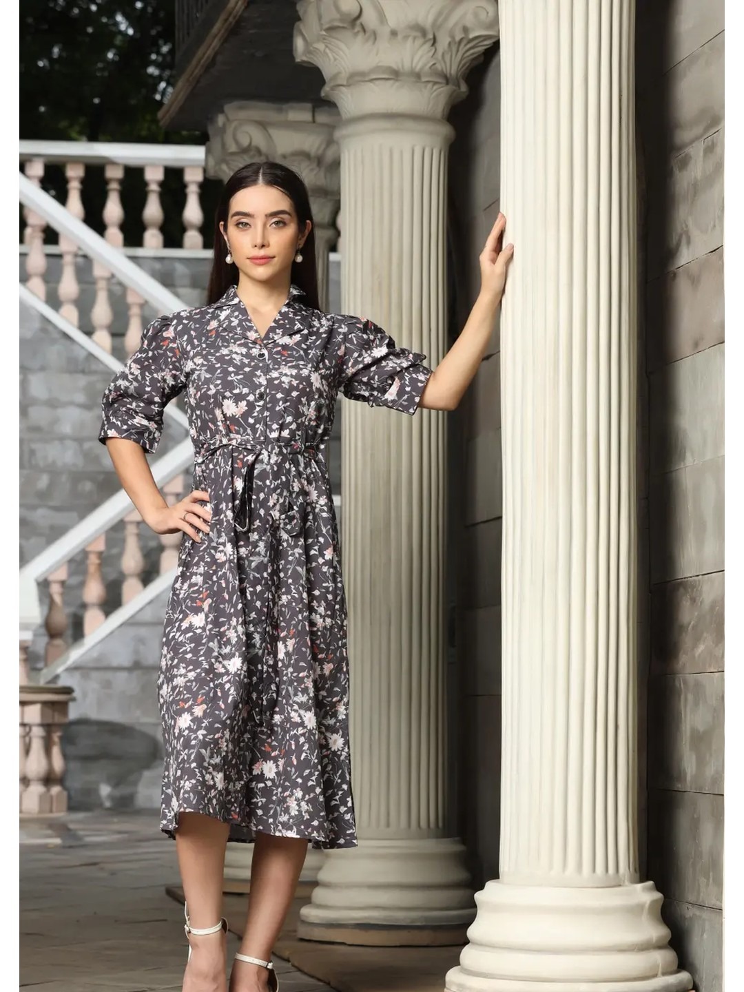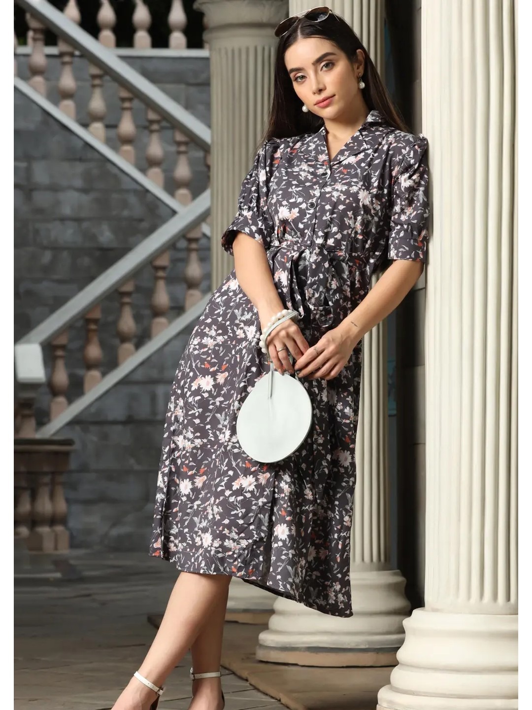 Grey Floral Midi Shirt Dress for Women that has vibrant floral prints, waist tie-up detail and a flowy midi length. This rayon floral midi shirt dress can be styled with solid accessories for a flattering feminine look.