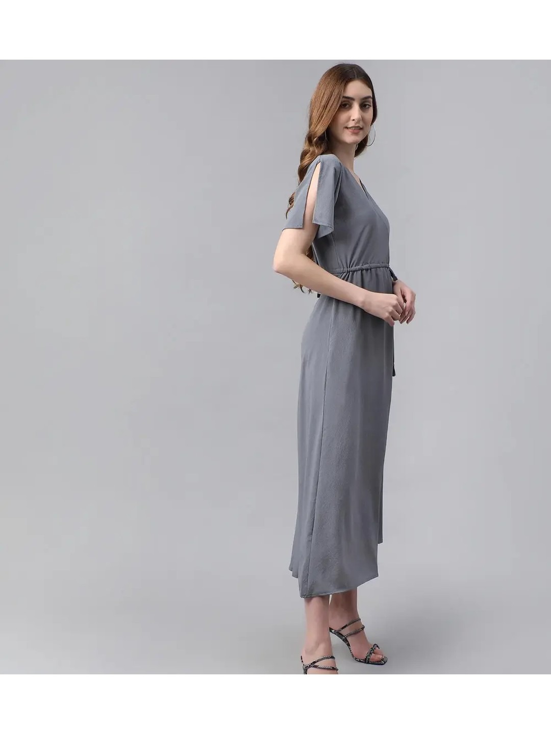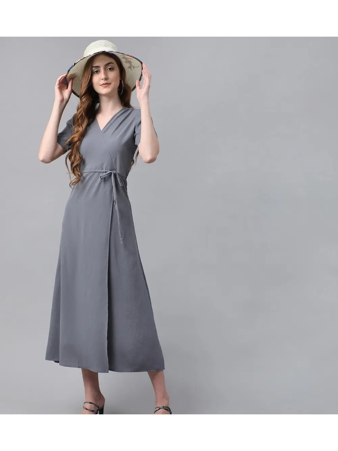 Grey Wrap Midi Dress for Women that has a waist tie-up detail, wrap style and a midi length. This grey wrap midi dress can be styled in versatile ways with apt accessories and footwear.
