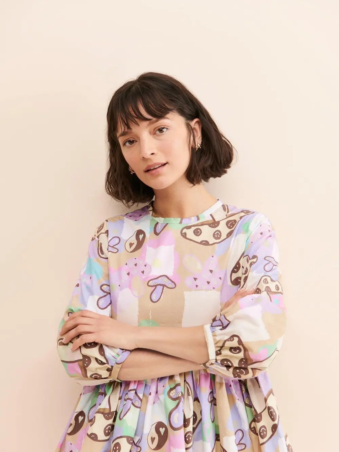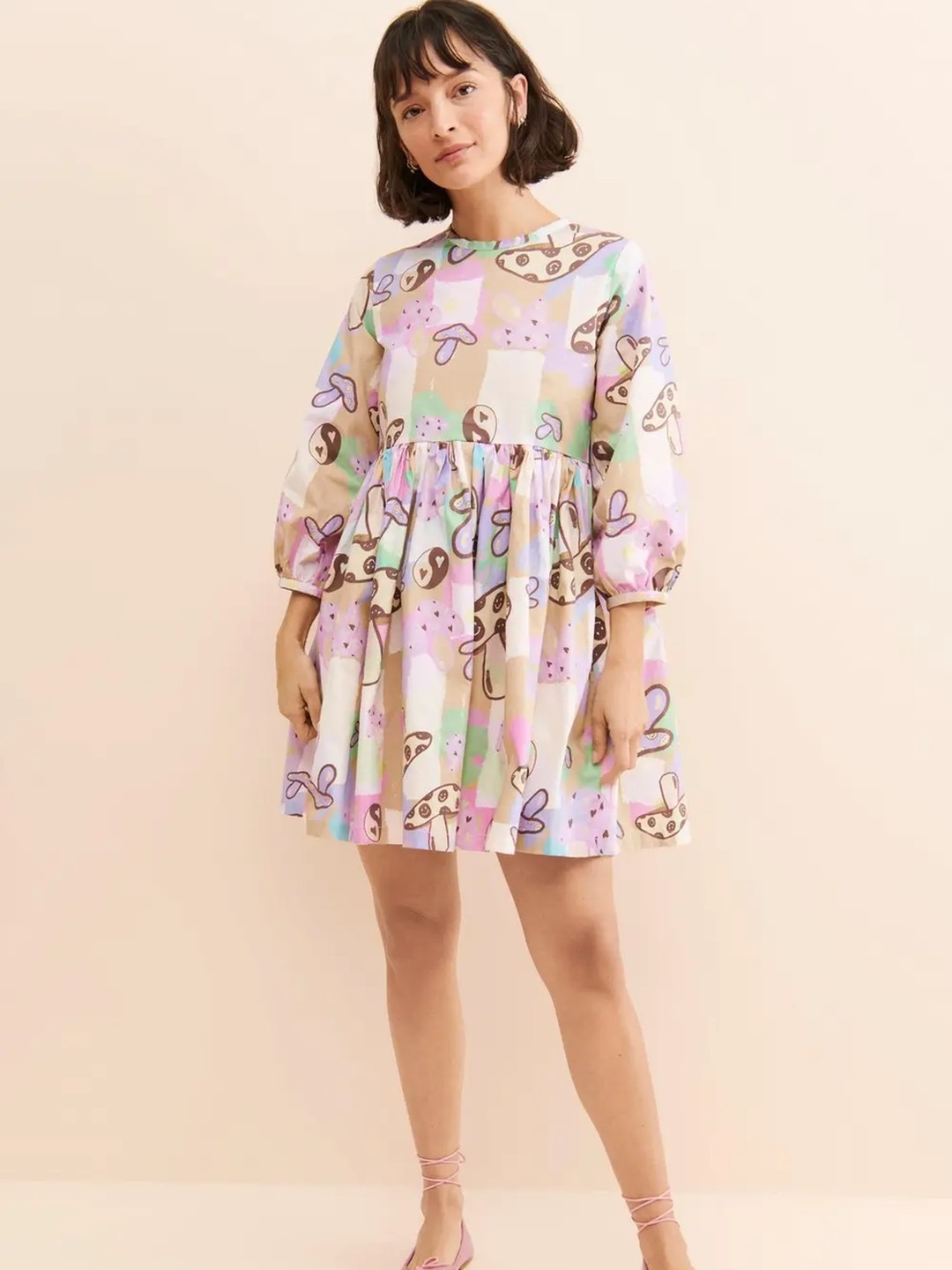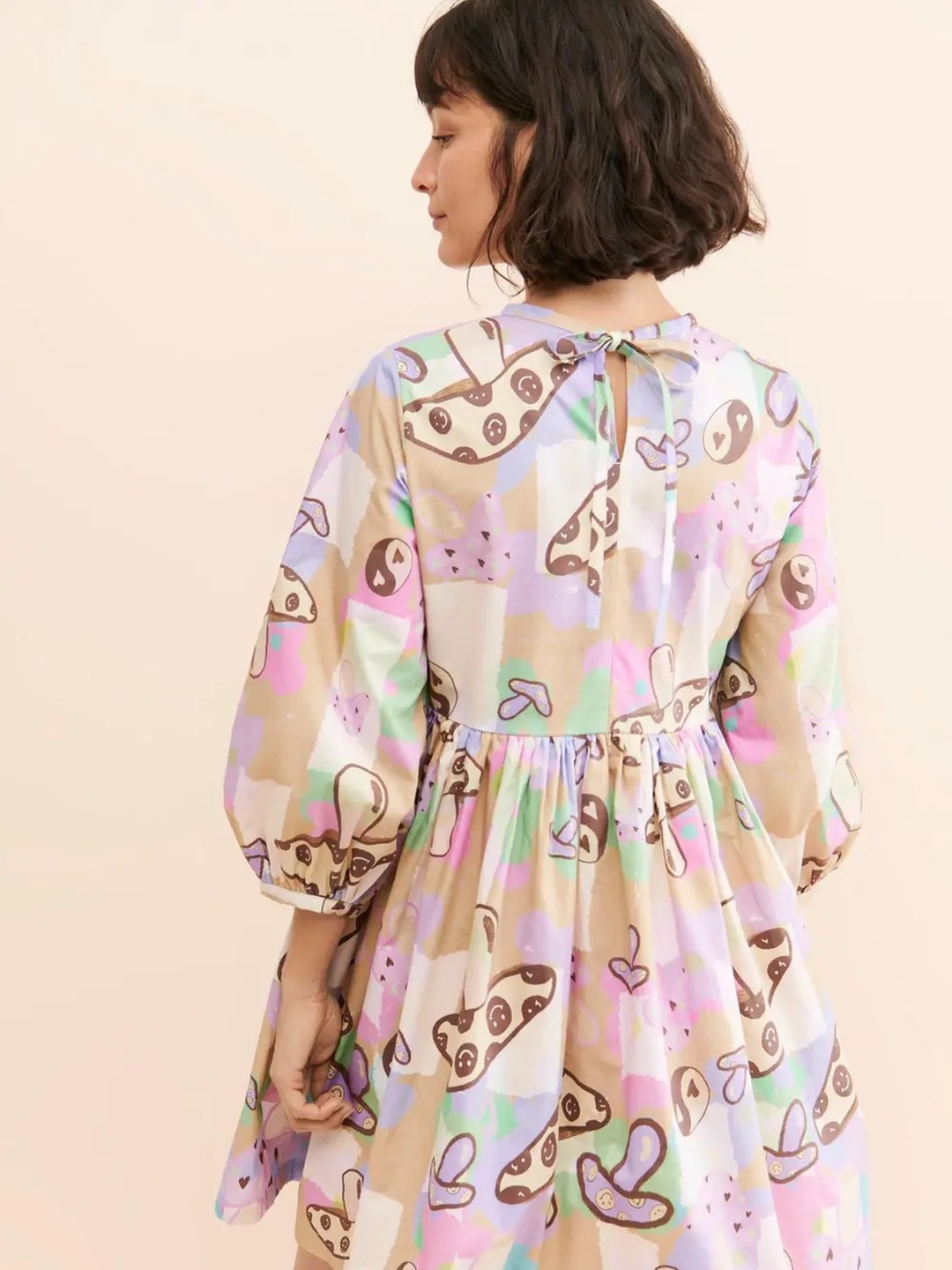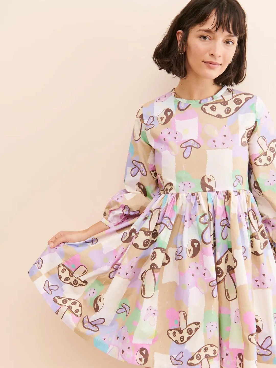 Light Pink Mushroom Printed Mini A-line Dress for Women that has quirky prints and an A-line style. This mushroom-printed mini A-line dress can be styled with delicate accessories for a soft girly vibe.