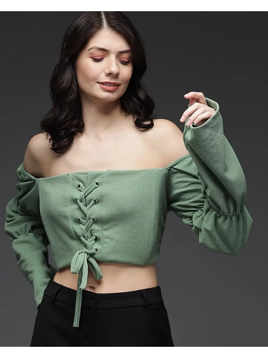 Mint Tie-up Off-Shoulder Crop Top for Women that has front tie-up detail, off-shoulder style and a cropped length. This lycra off-shoulder crop top can be styled with baggy pants and sneakers for a bold fashionable look.