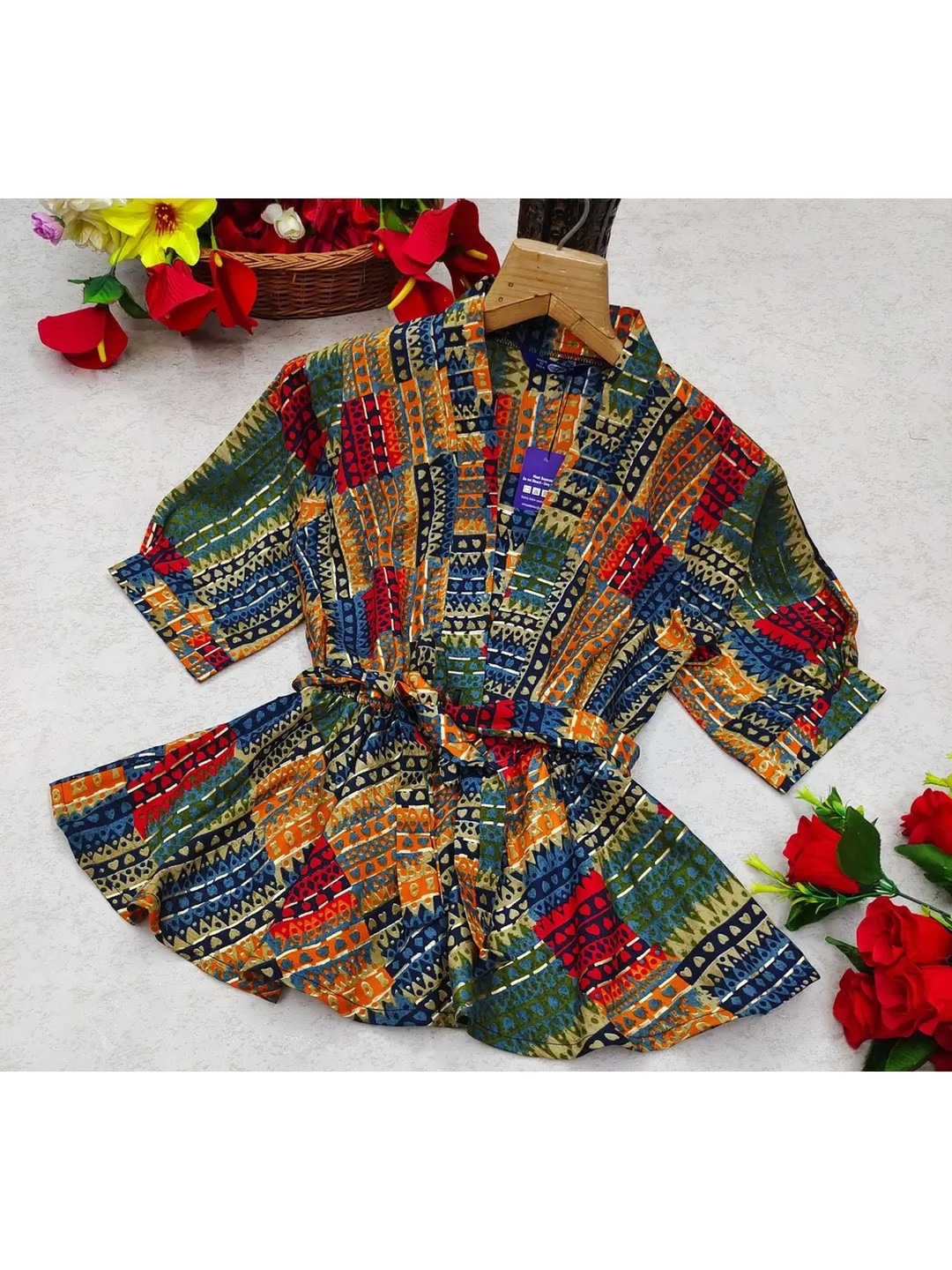 Multicolour Printed Ethnic Peplum Top for Women that has intricate ethnic prints, peplum style and waist tie-up detail. This rayon printed ethnic peplum top can be styled with jeans for a charming fusion look on festive season.