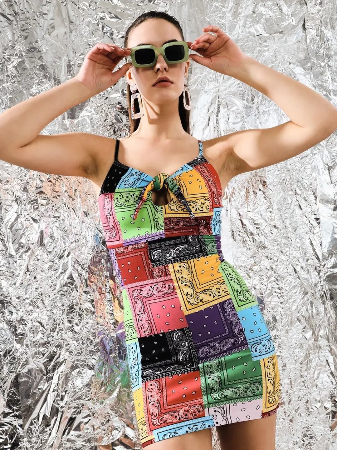 Multicolour Printed Mini Bodycon Dress for Women that has front tie-up detail and vibrant prints. This printed mini bodycon dress can be styled with simple accessories for a statement look.