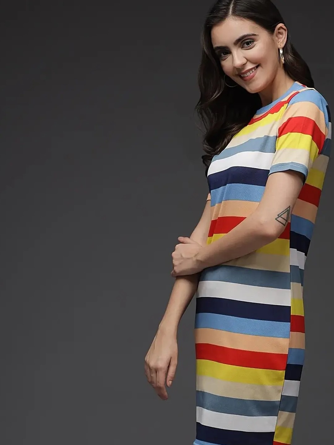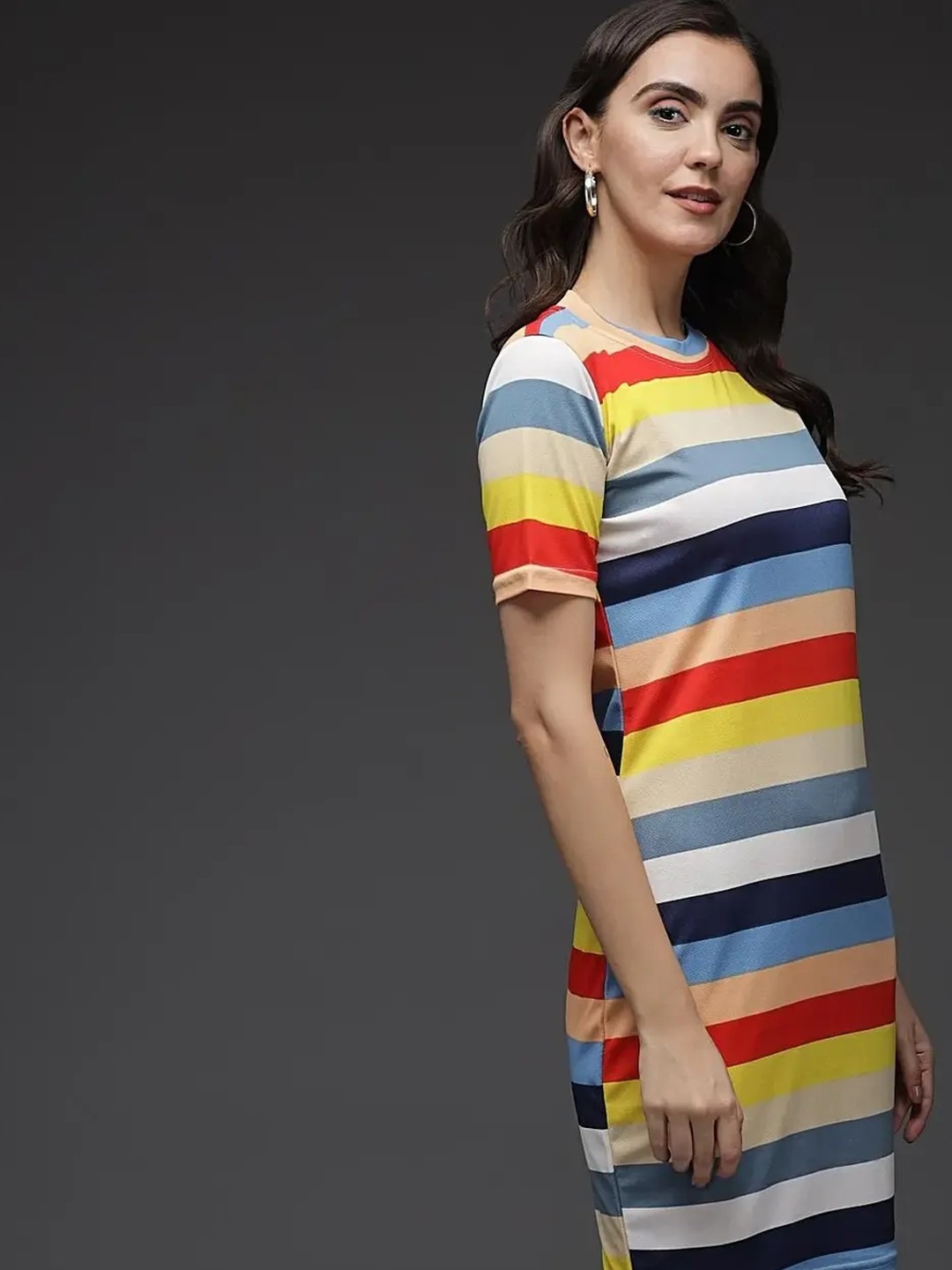 Multicolour Striped Midi Bodycon Dress for Women that has a slim fit and vibrant colours. This striped midi bodycon dress can be styled with simple accessories for a cute flattering look.