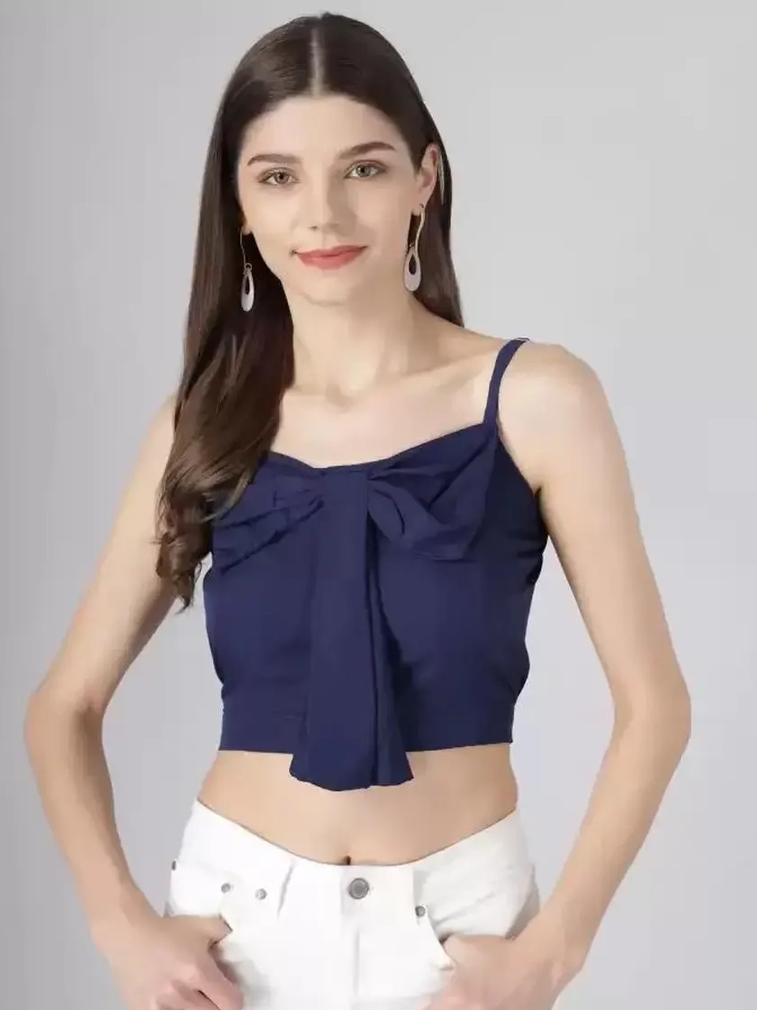 Navy Blue Bow Crop Top for Women that has a sleeveless cut and a cropped length. This bow crop top can be styled with flare bottoms for a balanced look.