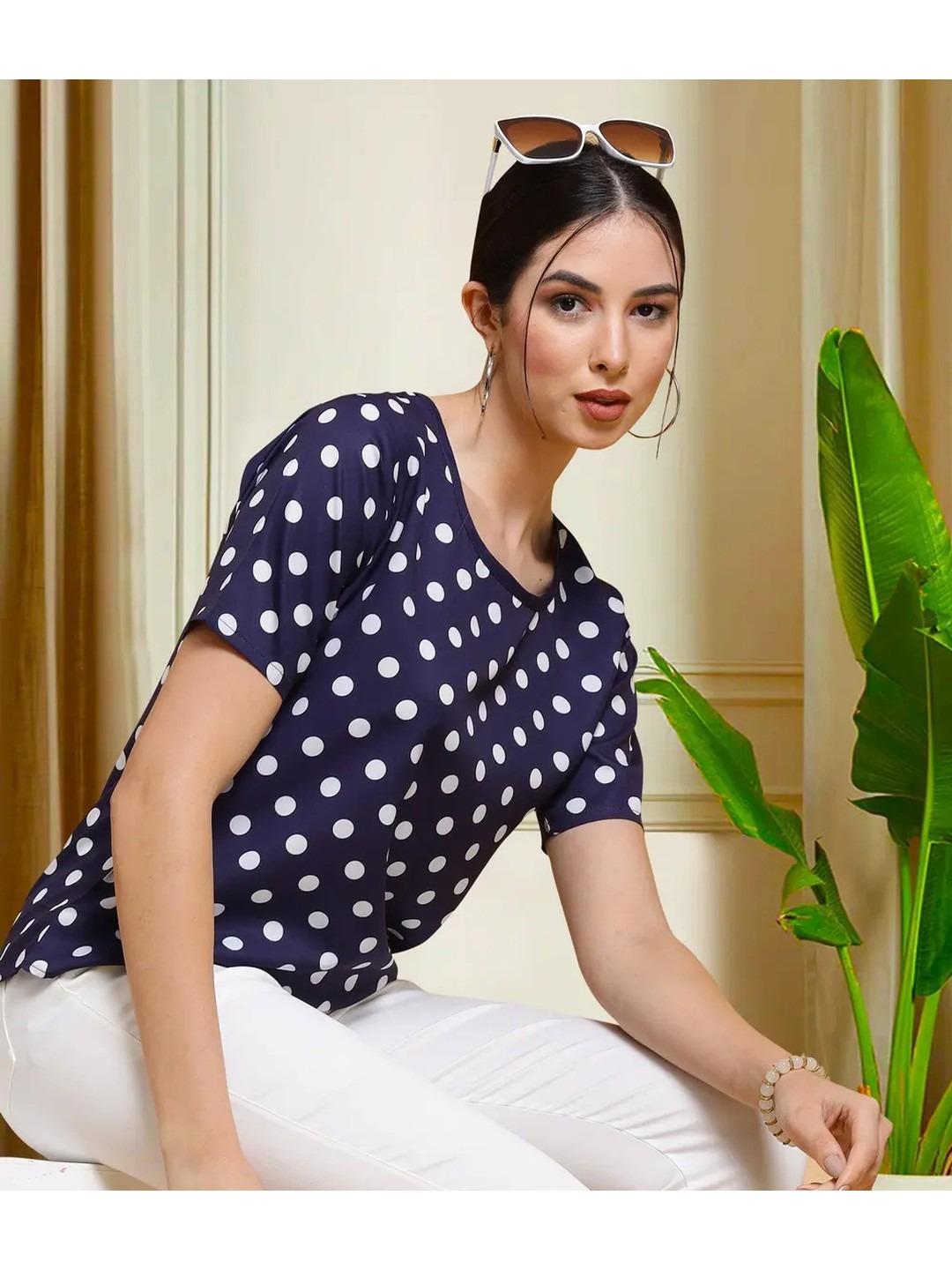 Product Name: Navy Blue Polka Dot Top for Women