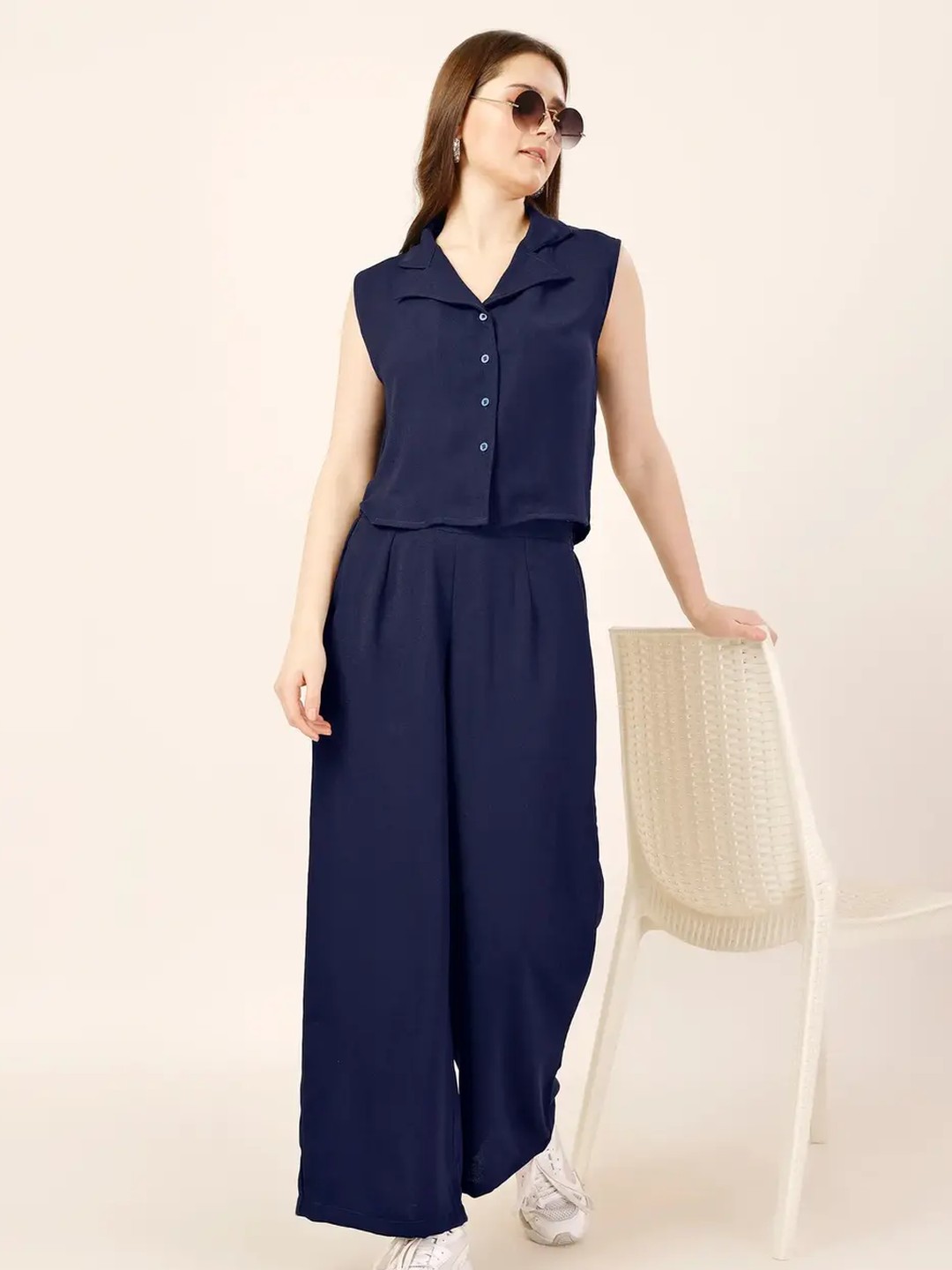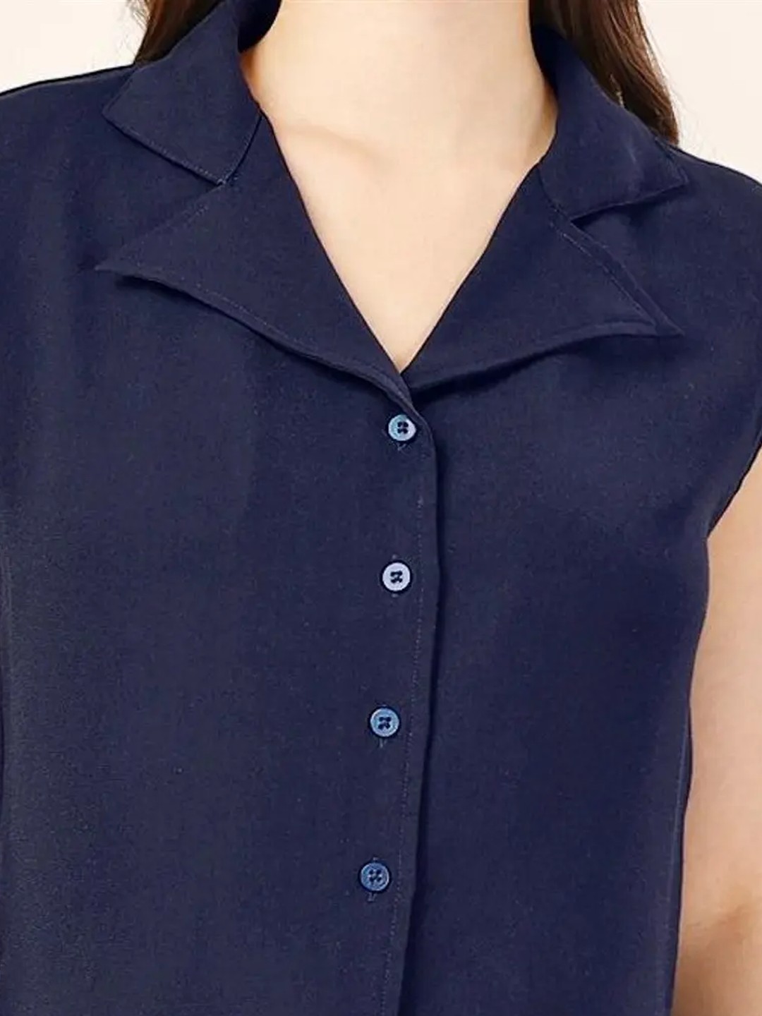 Navy Blue Shirt Co-ord Set for Women that has a relaxed fit and comes with a shirt and pants. This polyester shirt co-ord set can be styled with simple accessories for a chic look.