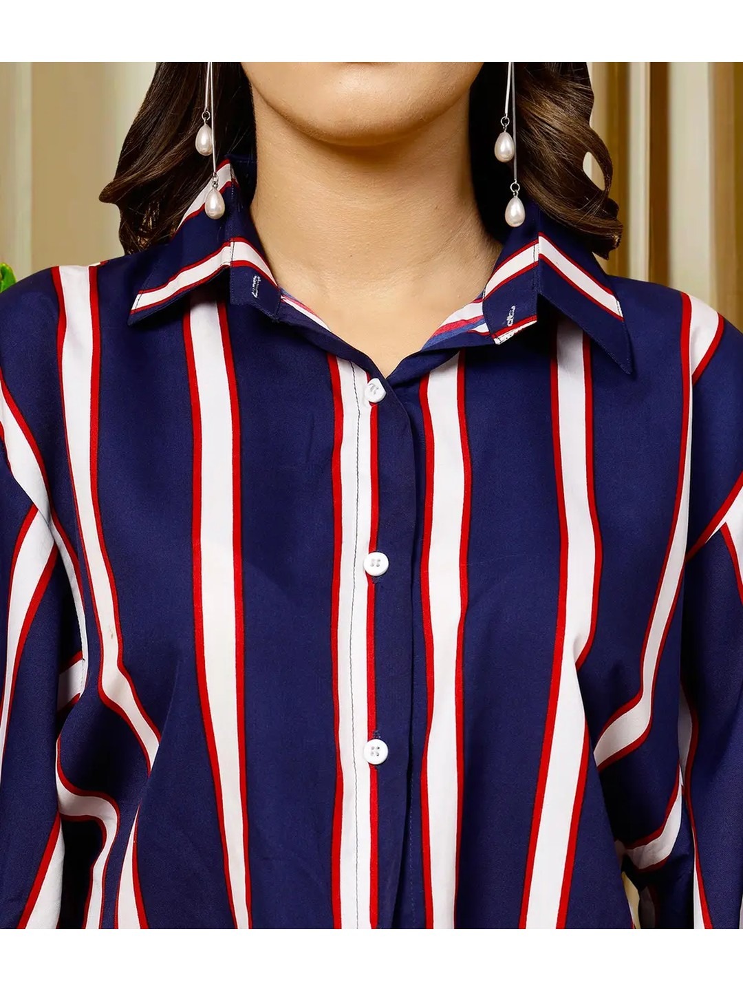 Product Name: Navy Blue Striped Boxy Shirt for Women