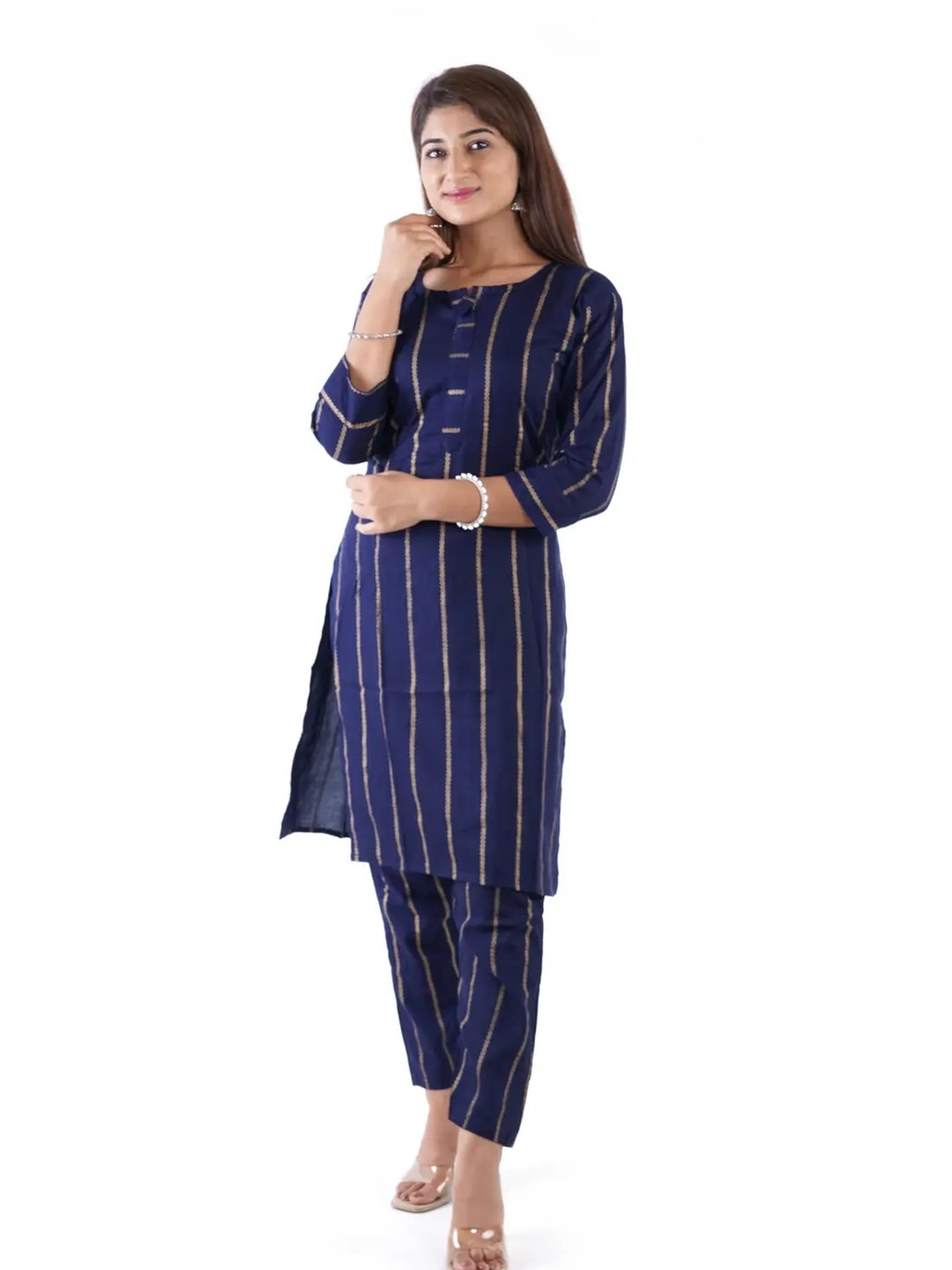 Product Name: Navy Blue Vertical Striped Straight Kurti Set for Women