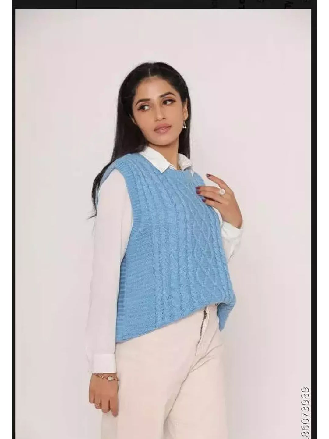 Product Type: Oversized Round Neck Knitted Sweater for WomenFabric: WoolColour: Sky Blue Sleeve Length: Sleeveless Pattern: Self-Design/Knitted Design Sizes: Free Size (Bust Size: 18 in, Length Size: 23 in) Country of Origin: India
