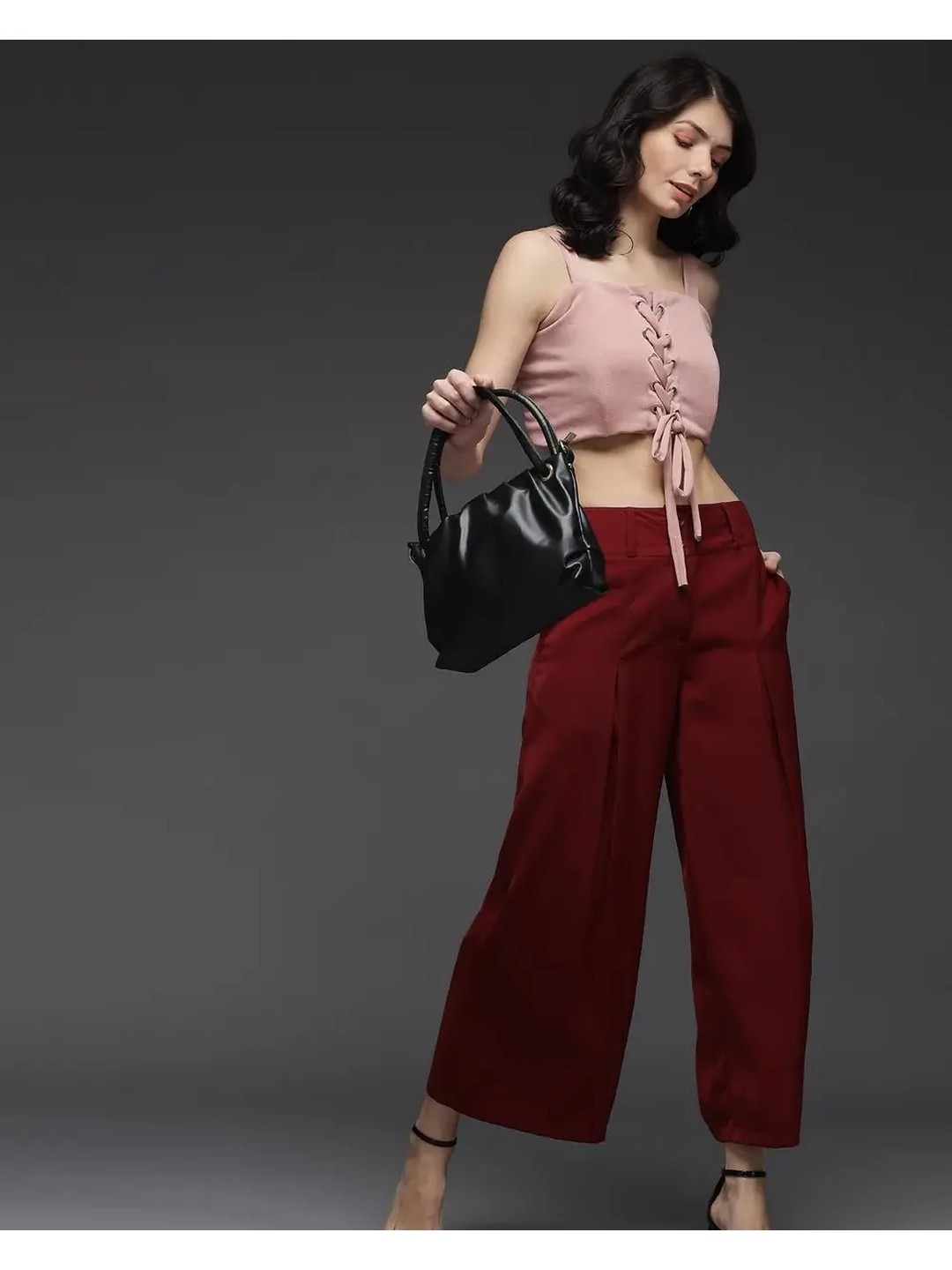 Peach Tie-up Crop Top for Women that has front tie-up detail, sleeveless cut and a cropped length. This lycra tie-up crop top can be styled with baggy pants and sneakers for a bold fashionable look.