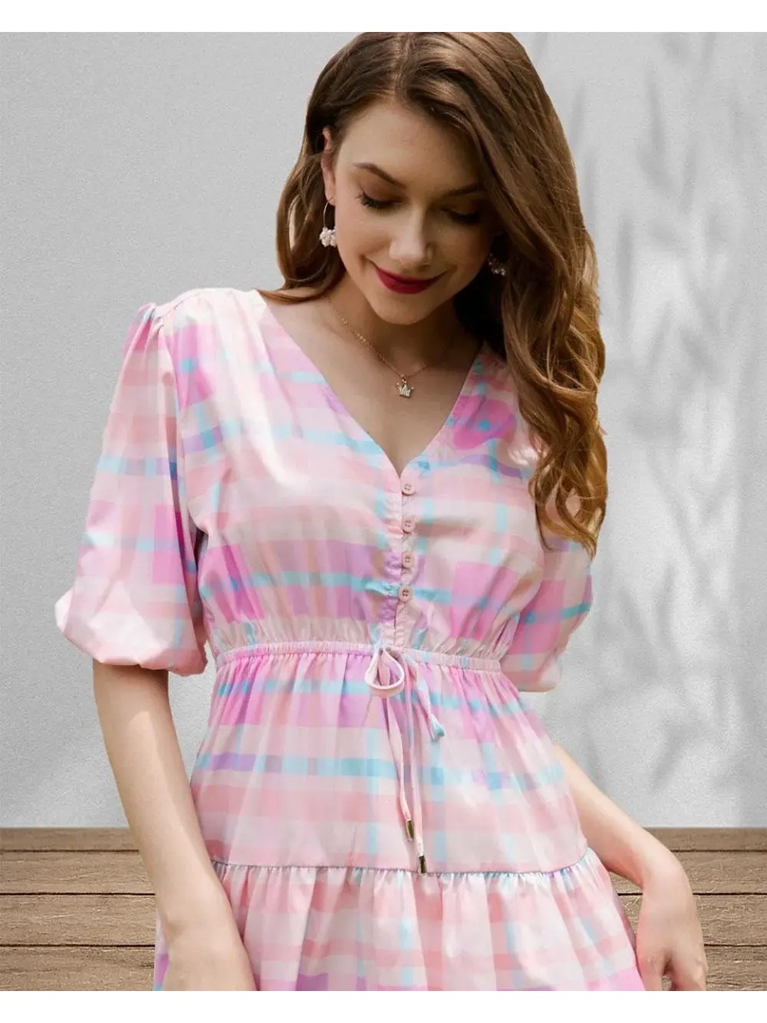 Pink Checked Fit and Flare Mini Dress for Women that has intricate checked pattern, mini length and a fit and flare style. This rayon checked fit and flare mini dress can be styled for a chic classy vibe.
