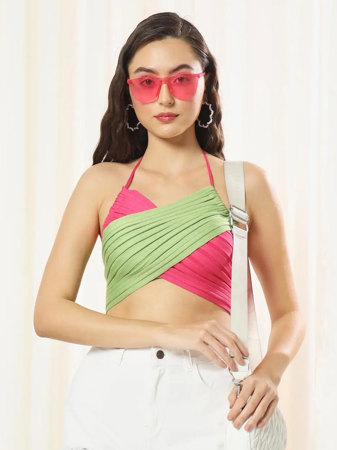 Pink Contrast Bralette Top for Women that has a bodycon fit and a cropped length. This contrast bralette top can be styled with flare pants for a trendy casual vibe.