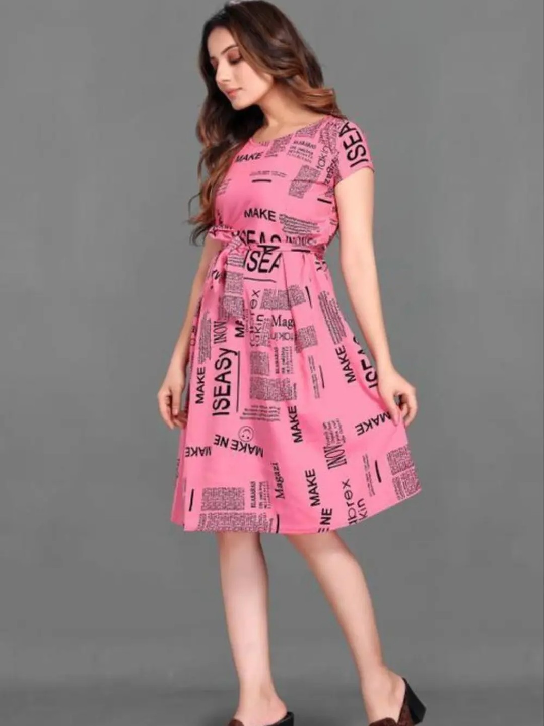 Product Name: Pink Typography Korean Midi A-line Dress for Women
