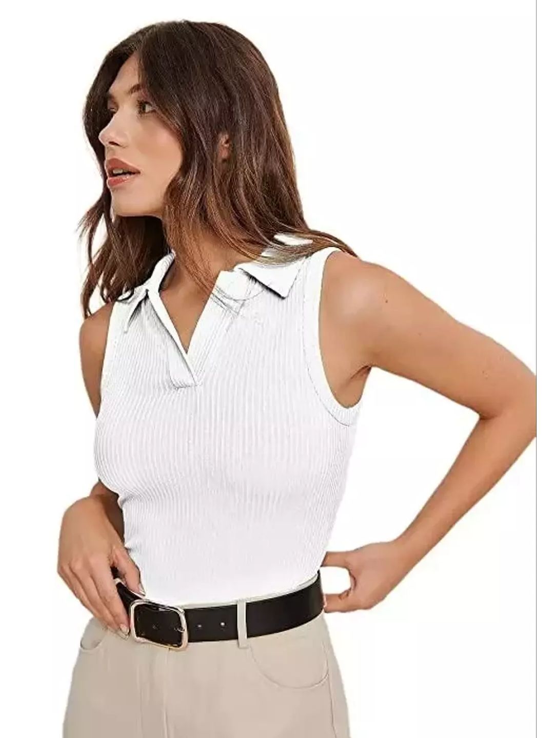 Product Type: White Polo Neck Bodycon Tank Top for Women Fabric: Cotton BlendColour: White Sizes: S, M, L, XLCountry of Origin: India