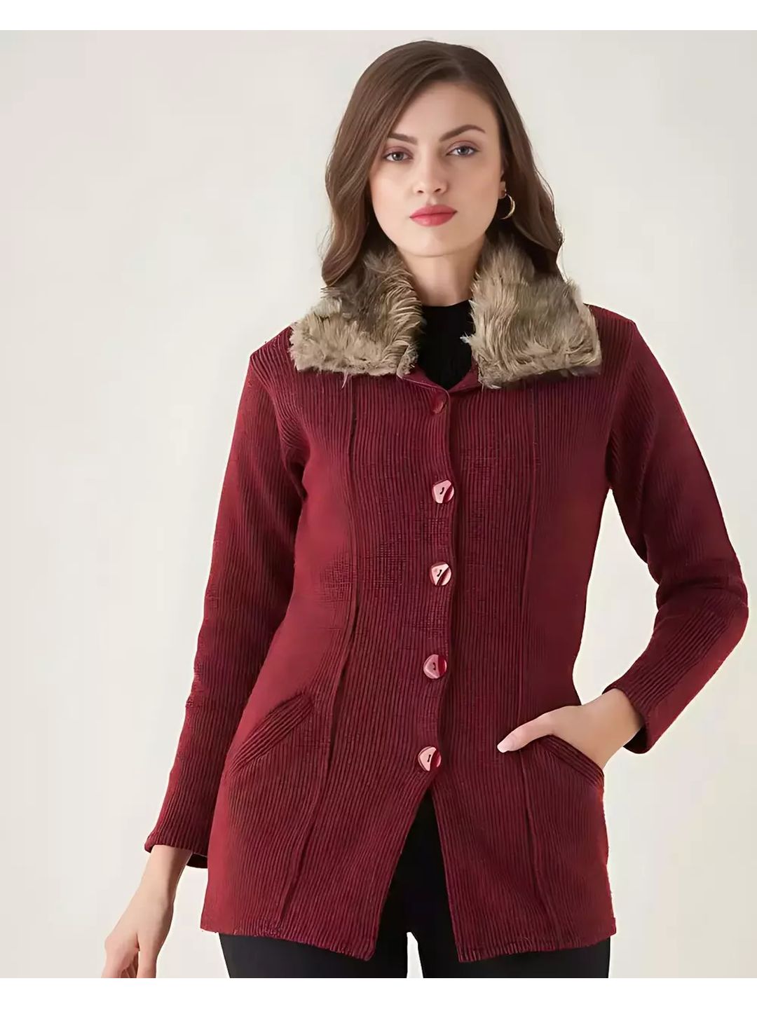 Product Type: Premium Faux Fur Woollen Cardigan for WomenFabric: WoolColour: Maroon Sleeve Length: Long Sleeves Pattern: Solid Sizes: XL (Bust Size: 36 in, Length Size: 27 in) Free Size (Bust Size: 37 in, Length Size: 28 in) Country of Origin: India