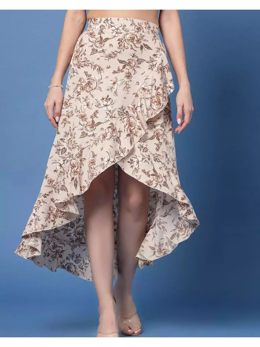 This vibrant high-low skirt is made from a crepe fabric that is perfect for summer. It comes in a wrap-style design and delicate ruffles with a high-waisted A-Line fit. Pair this midi skirt with a solid crop top and quirky accessories for that perfect relaxed boho look.