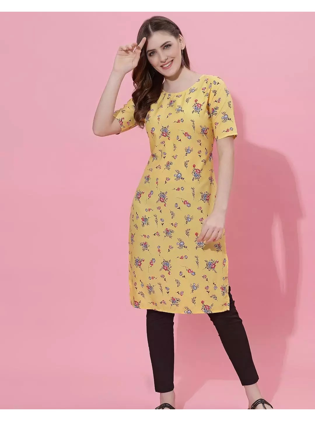 Regular straight kurta with vibrant prints, high neck and above-elbow sleeves that are perfect for daily use. Made with poly crepe fabric, this kurti is super light and easy-to-wash that makes it a perfect choice for summer. Style this chic and modern with jeans, palazzos or cigarette pants for a stunning desired look.