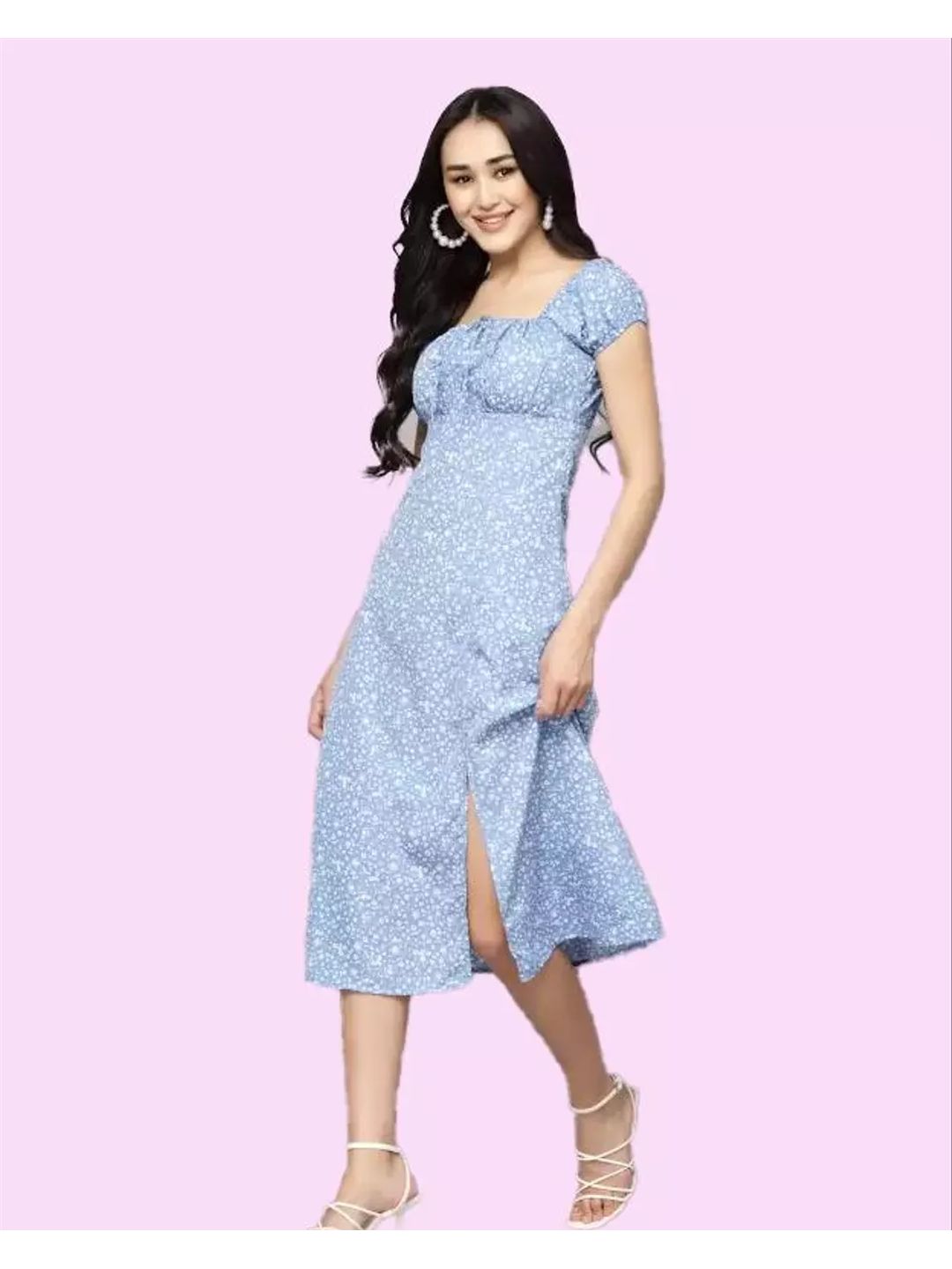 Product Type: Printed Tie-Knot Midi Slit Dress for WomenFabric: CrepeColour: BlueSizes: S, M, L, XLCountry of Origin: India